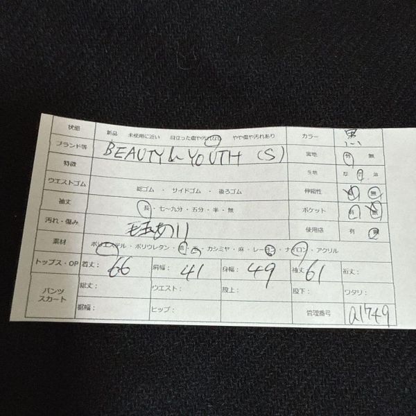 - ブランド:BEAUTY & YOUTH(ビューティアンドユース) - アイテム:フード付きウールジャケット - サイズ表記:S - カラー:ブラック(黒) - 素材:ポリエステル・ウール混 - 特徴: 裏地のチェック柄が印象的な、BEAUTY & YOUTHのウール混フードジャケット。 軽くて暖かく、カジュアルにもキレイめにも合わせやすいデザイン。 前立てはジップとボタンのダブル仕様で、防寒性も高めです。 両サイドにポケット付き、内側もおしゃれなブルーチェック裏地。 - 状態:やや毛玉あり(全体的にはきれいな状態) 管理番号:a1749 即購入大歓迎・お得な割引各種あります 詳しくはプロフィールをご覧ください! 匿名&送料無料 海外輸入のため全て一点ものです 古着のため使用感・毛玉等があることもあります。写真で状態の確認を行なってからご購入ください おまとめ買いでお得な割引あります♪ 平置き採寸表→写真から確認いただけます! (素人採寸のため、多少の誤差はご了承ください) 商品状態に関しては、写真、商品説明欄に記載しております。着用回数、購入時期などはお答えできませんので、ご了承ください。着画、写真の追加もお断りしております。 簡易包装のコンパクト発送となります。 畳みシワはご了承の程、宜しくお願いいたします。 商品によっては圧縮してお送りするものもございます。 撮影環境や使用するモニター、反映されにくい色味など、 商品と画像に若干の色誤差が生じますことをご了承ください。 出品作業の際にしっかりと確認はしておりますが、シミなどの見落としがある場合もございますのでご了承下さい。 古着の取り扱いになりますので特有の匂い等がある可能性があります。ご理解のある方のみご購入の程お願い致します。