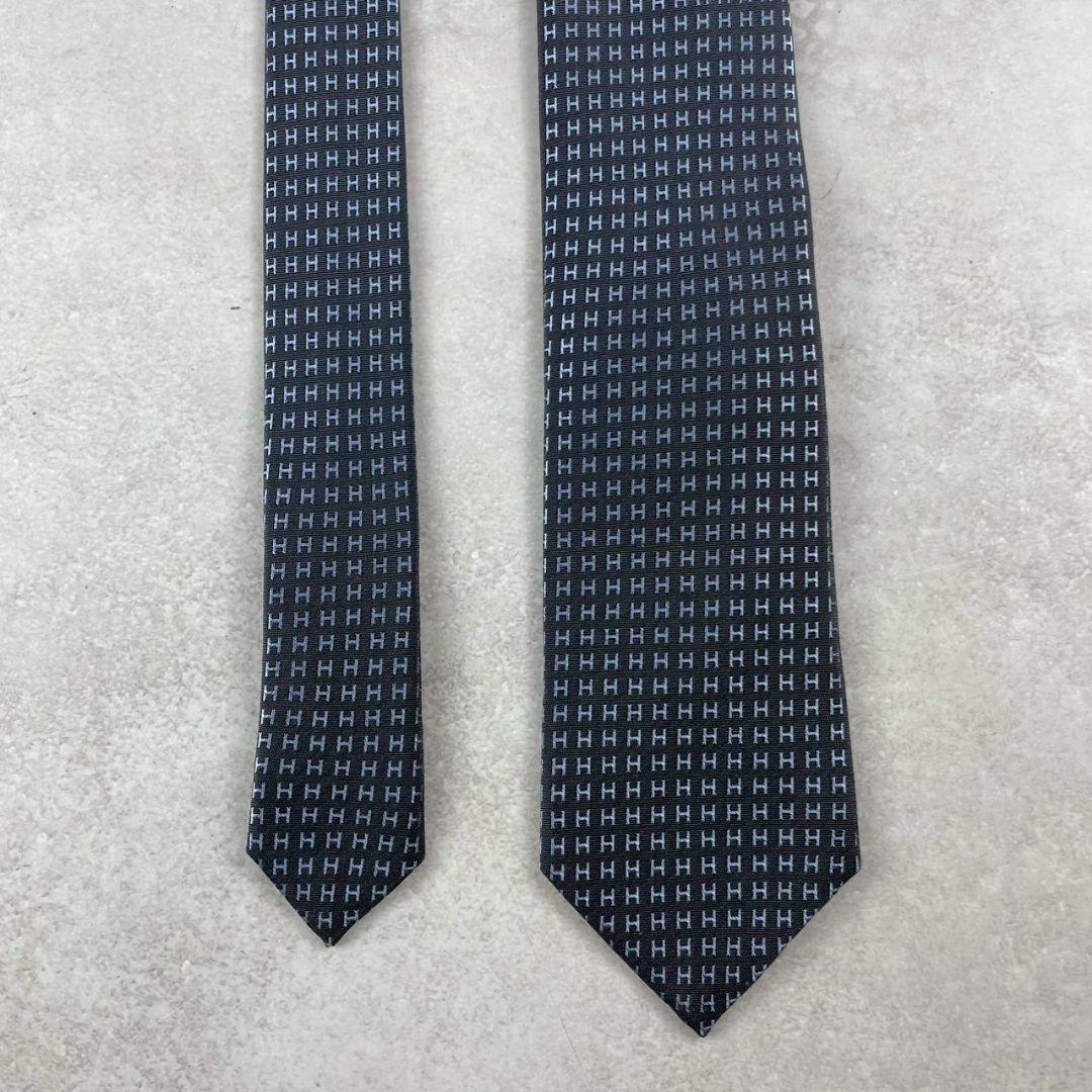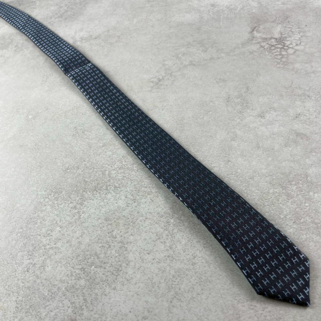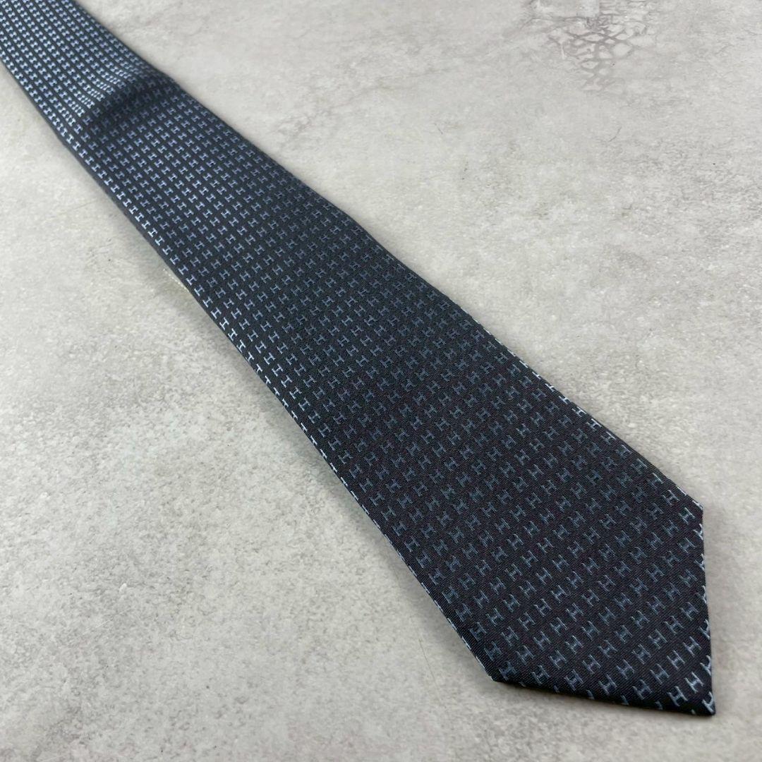 ダークブルーのシルク製ネクタイ、Hのロゴパターンが特徴。
