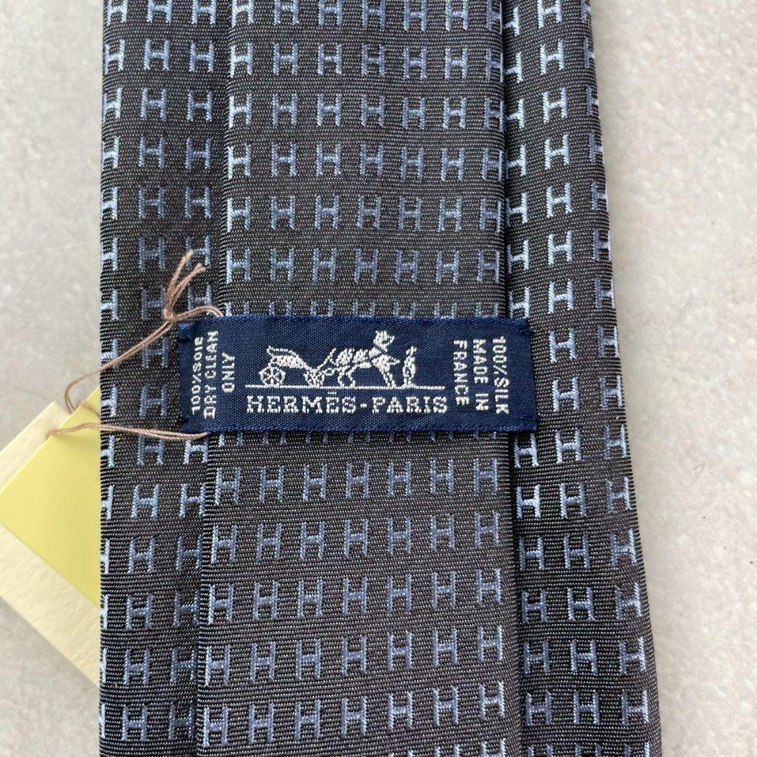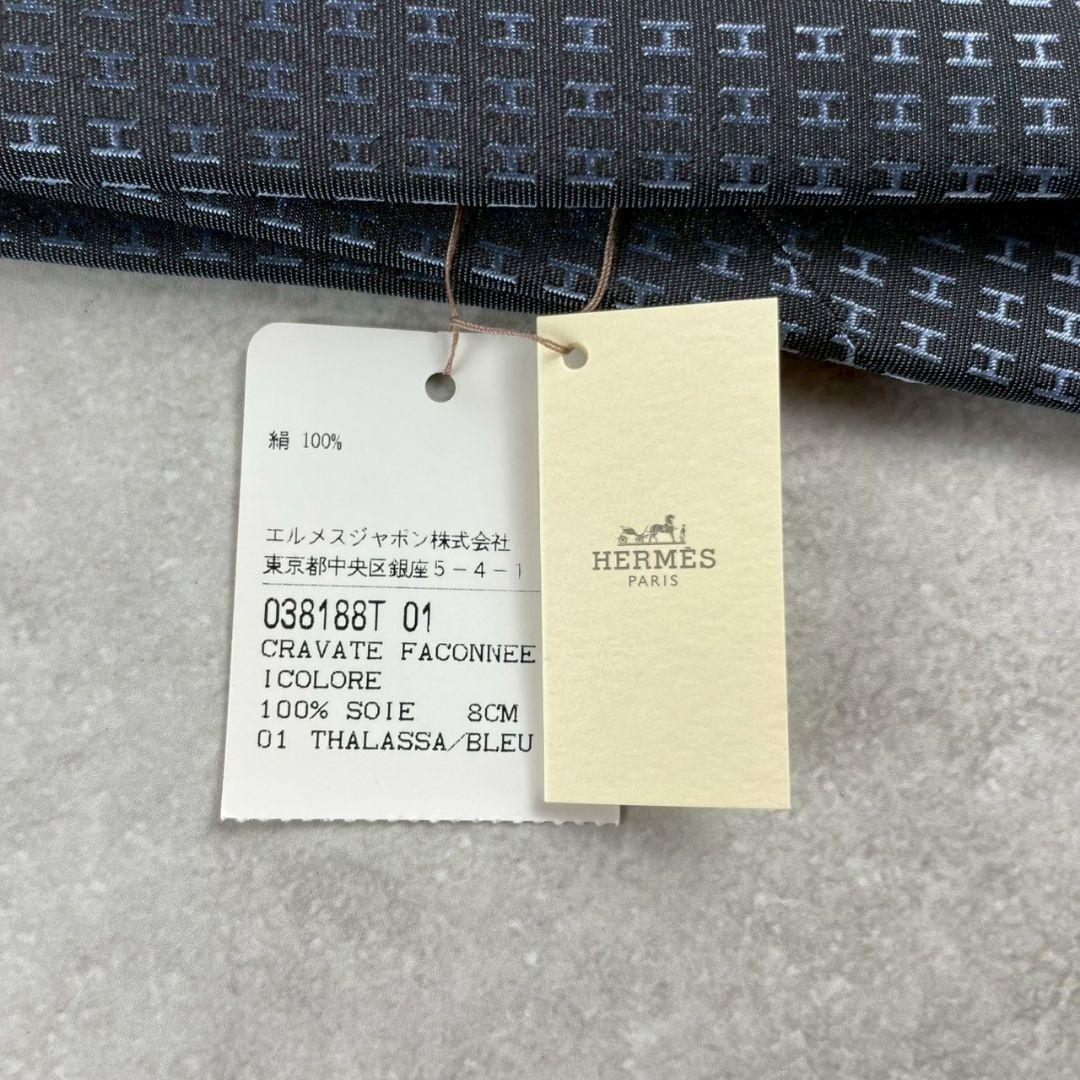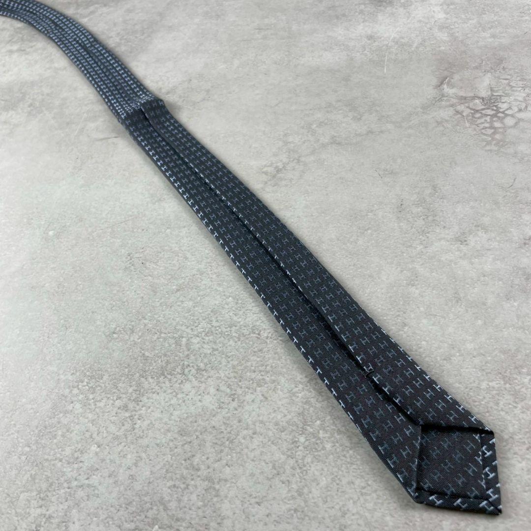 ダークブルーのシルク製ネクタイ、Hのロゴパターンが特徴。