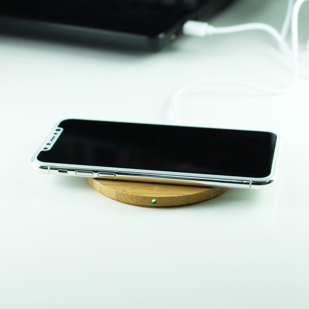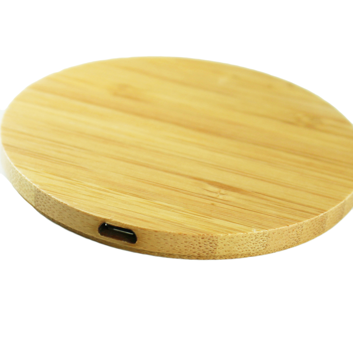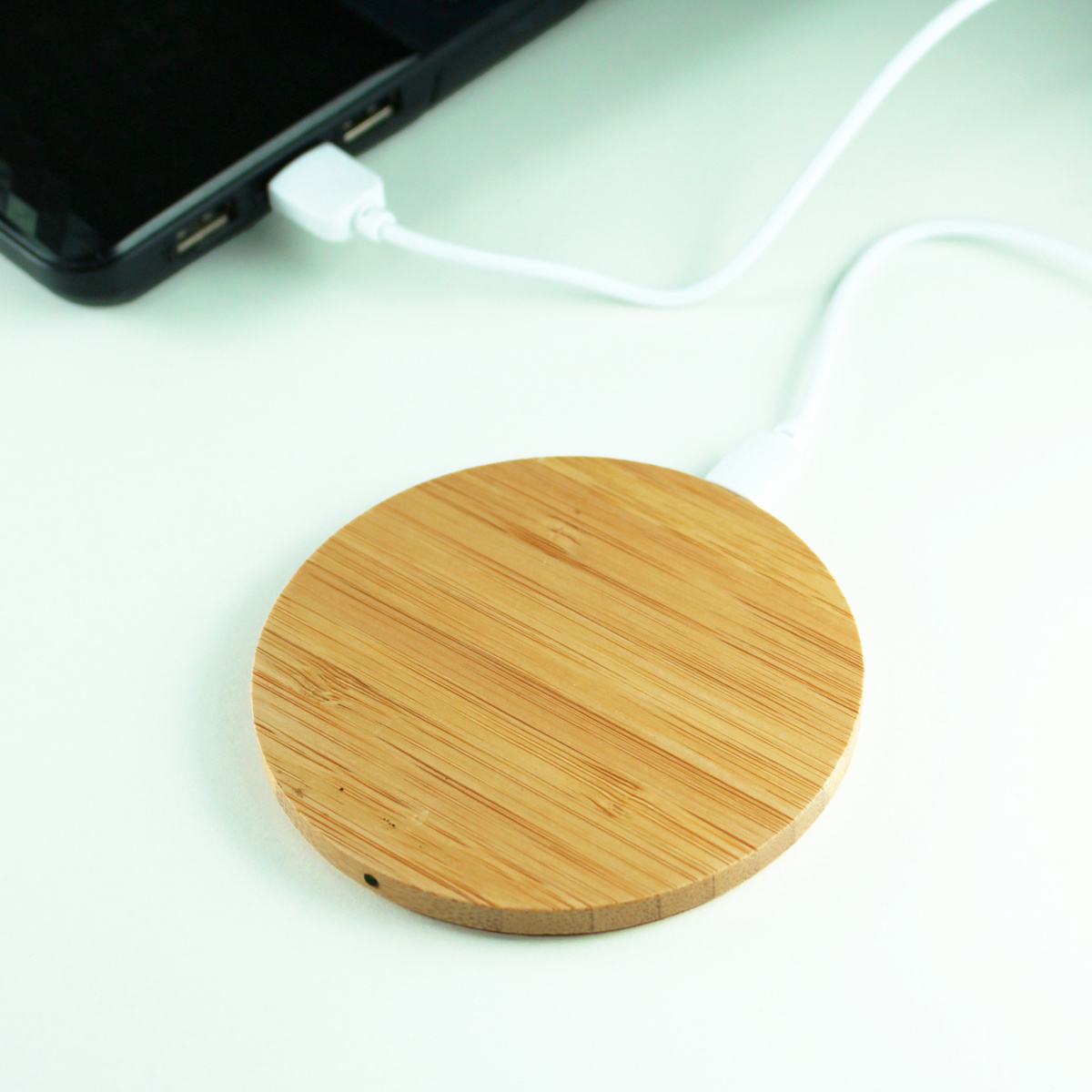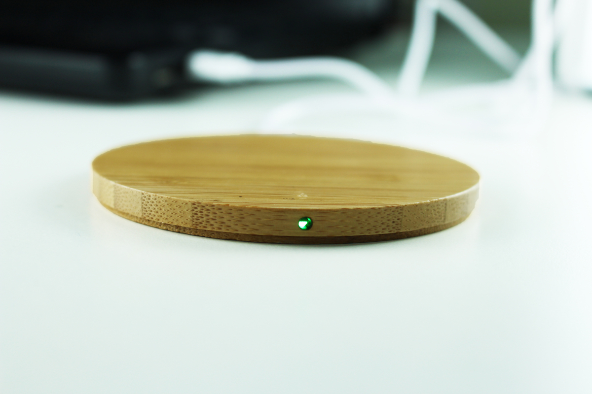 ワイヤレス充電器本体の表面は、温かみのある竹素材を採用。厚さも約8mmと薄型で使いやすい。