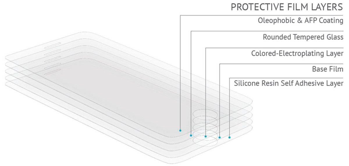ガラスフィルムは5層構造になっています。材料には安全・安心の日本製素材を使用!
