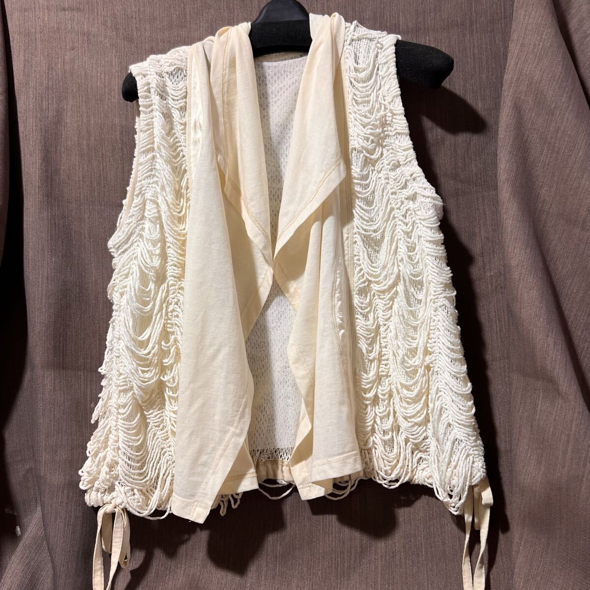 商品説明:C3156 EIKO KONDO エイココンドウ ベスト ノースリーブ 羽織り アイボリー ボレロ フリンジ風ループ装飾付き 襟付き ユーズド 状態画像にて 現状にて
