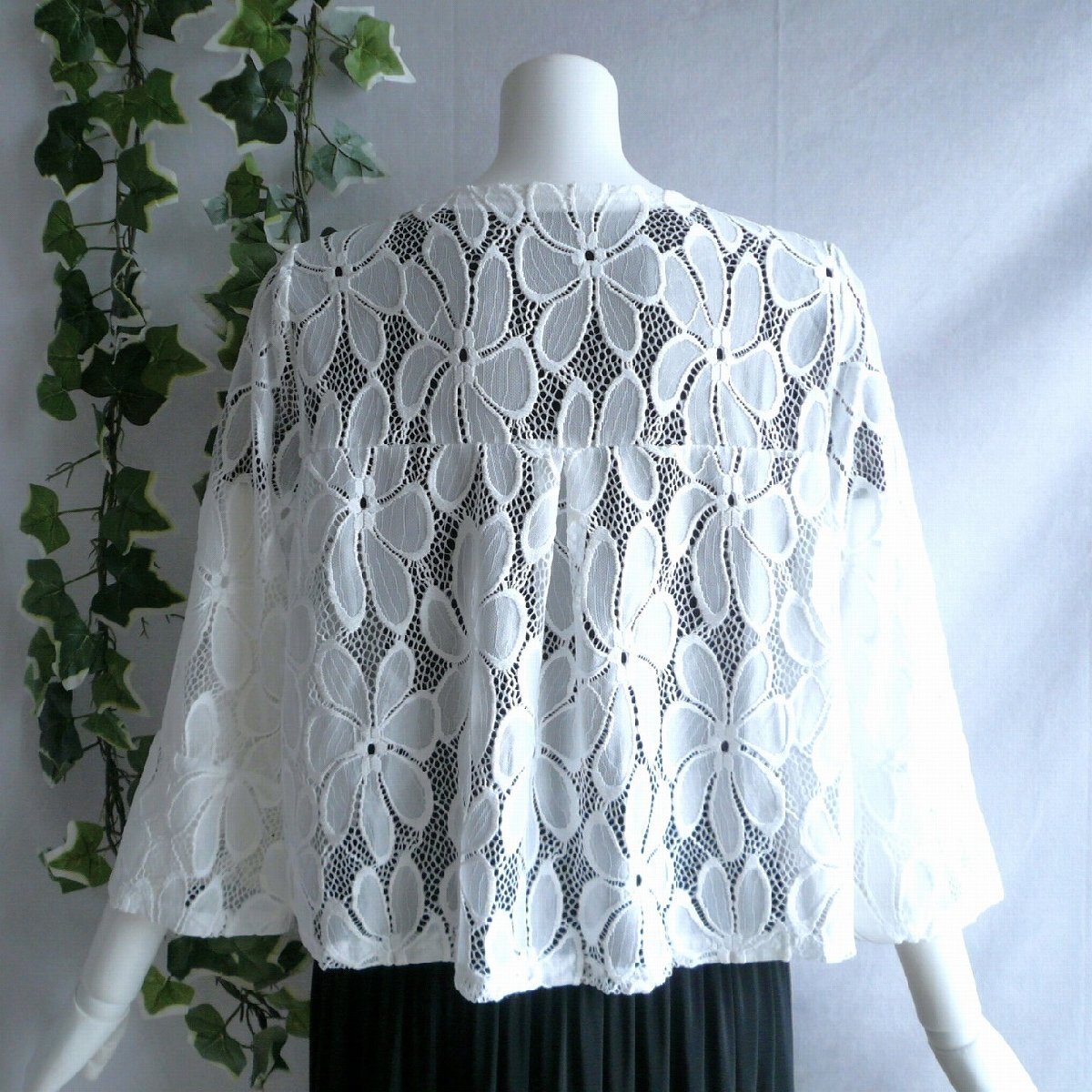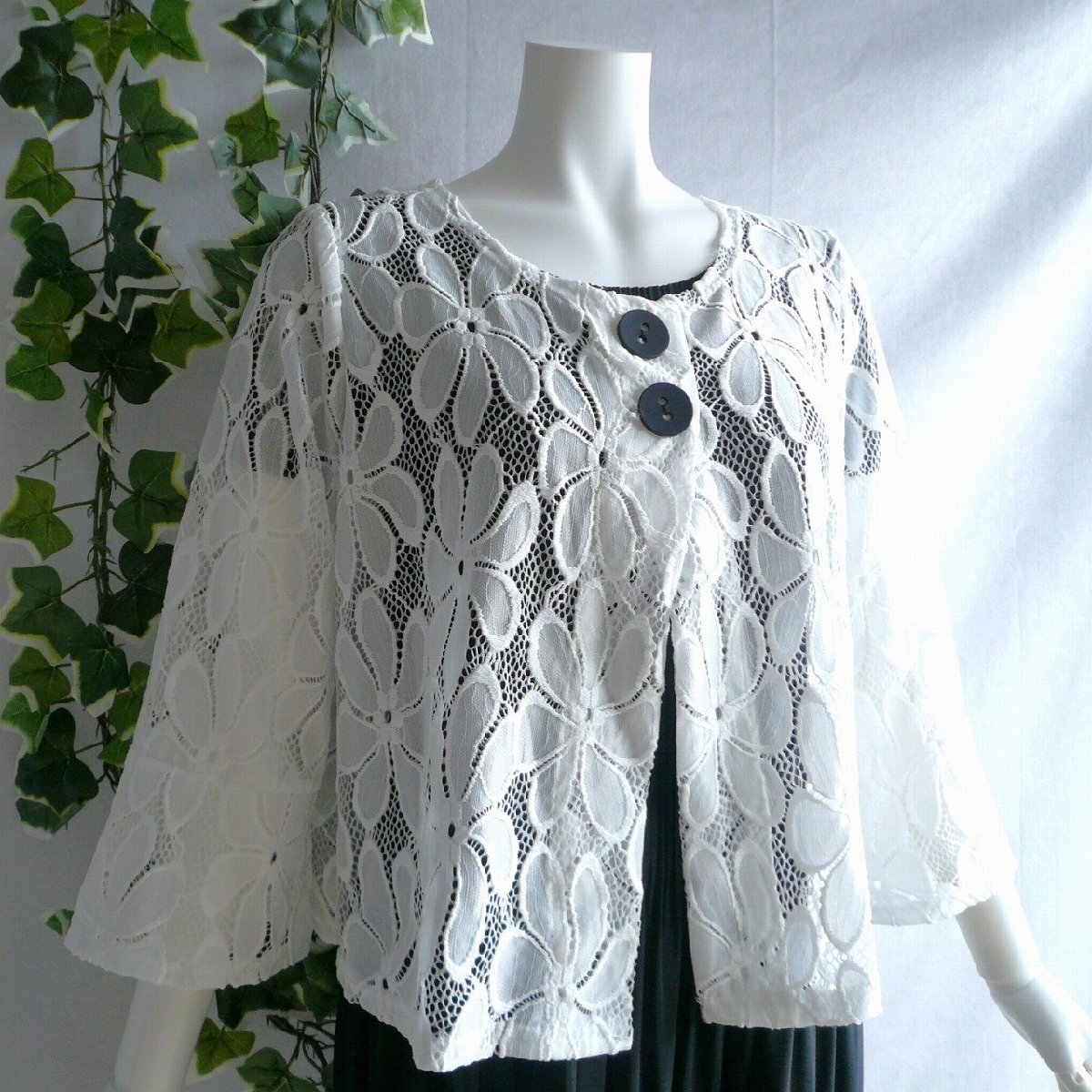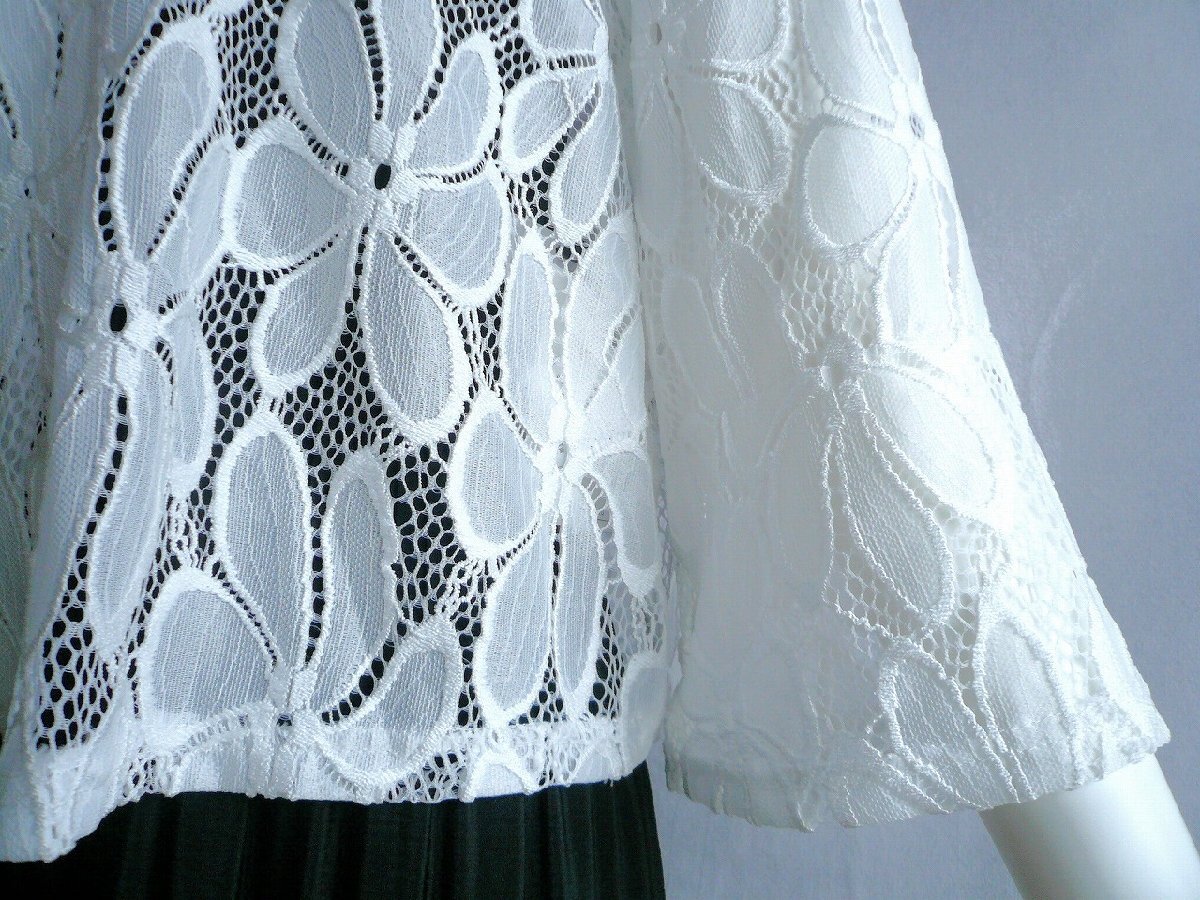 新品 9595 ML カットワーク 刺繍 クロシェ レース フレア ジャケット 春 夏 白 レディース ノーカラー 七分袖 上質 上品 50代 60代 70代
