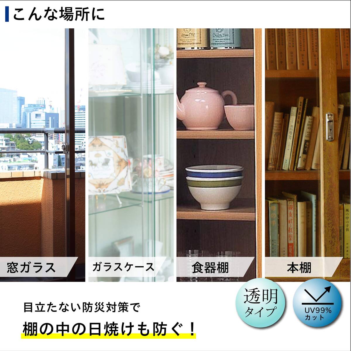 説明 【防災】いざというときのガラスの飛び散りを防ぎます ●使用後はのり残り少なくはがせます ●UVカット率99%で日焼け防止も