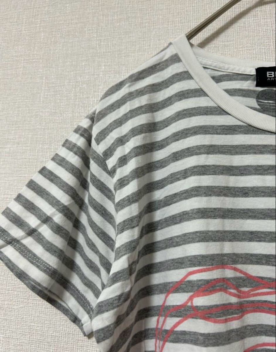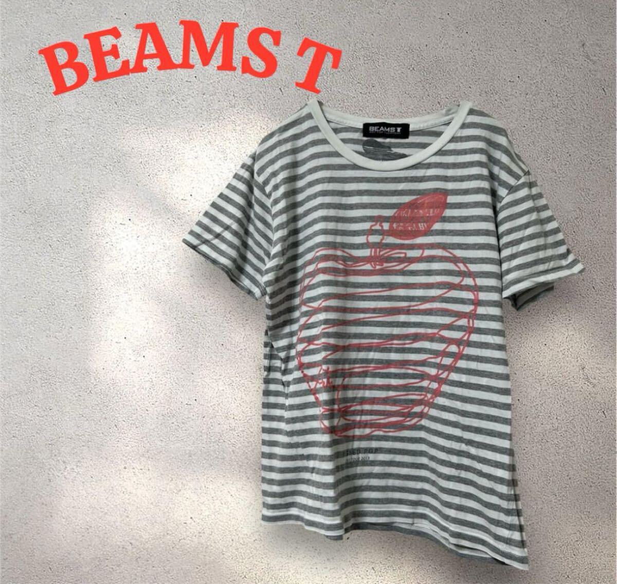 ストライプ柄のBEAMS Tシャツ、リンゴのグラフィック付き。