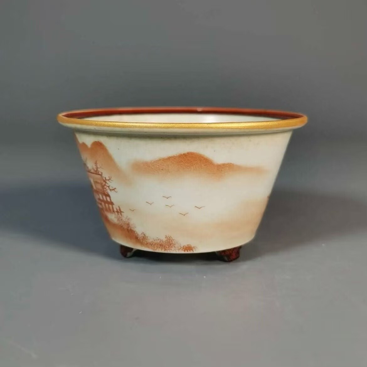 「赤絵山水風景図 × 外縁装飾」の調和がもたらす雅な美しさ赤絵の暖やかな彩りと山水の叙情的な表現、外縁の精緻な造形美が融合し,「伝統工芸の奥深さ」と「視覚的な洗練されたインパクト」を両立させています。光が当たると釉薬の艶と赤絵の彩りが絡み合い,風景図の立体感と円鉢の高級感が一層引き立ちます。