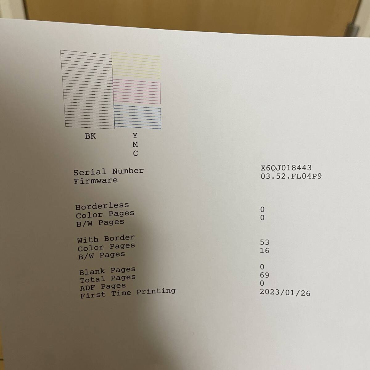 印刷トータル枚数は100枚以下ですが、あまり使っていなかったせいか、印字結果に若干のカスれ?があります。