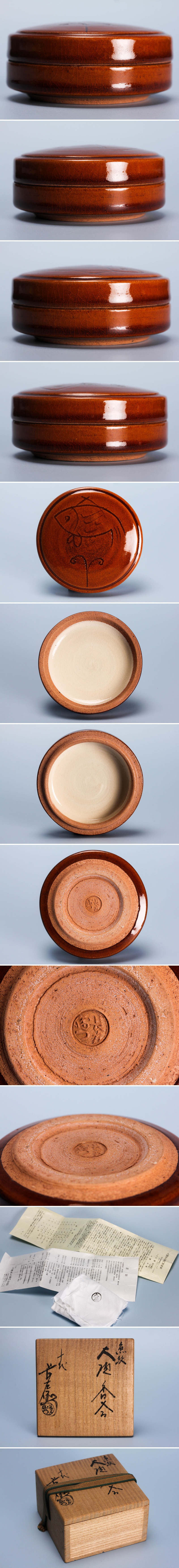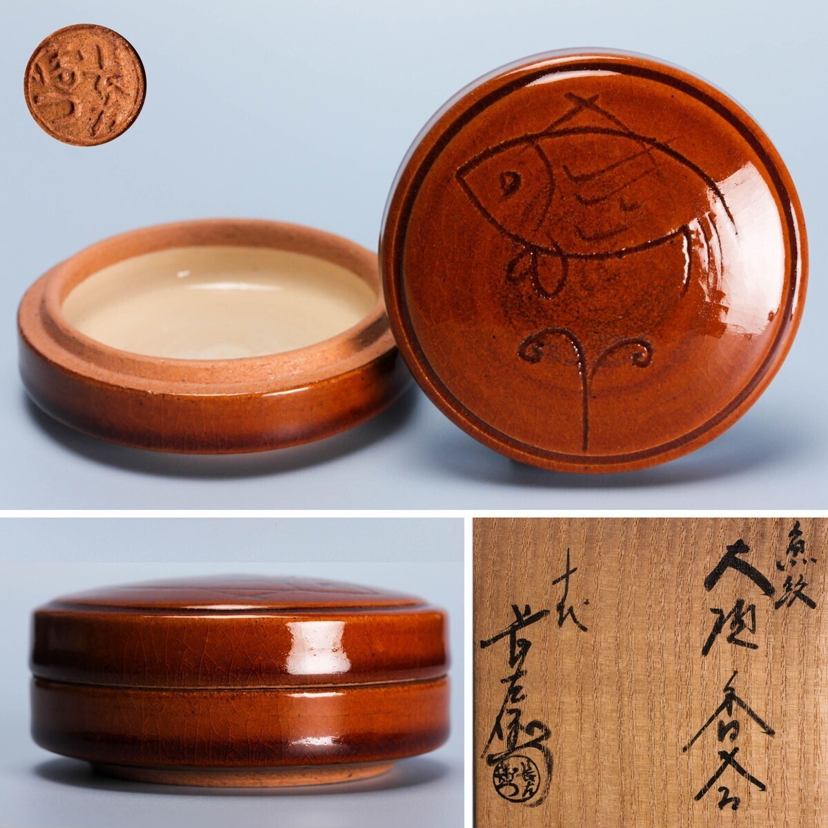 十代 大樋長左衛門(年郎) 魚紋大樋香合 共箱 共布 栞 茶道具 本物保証