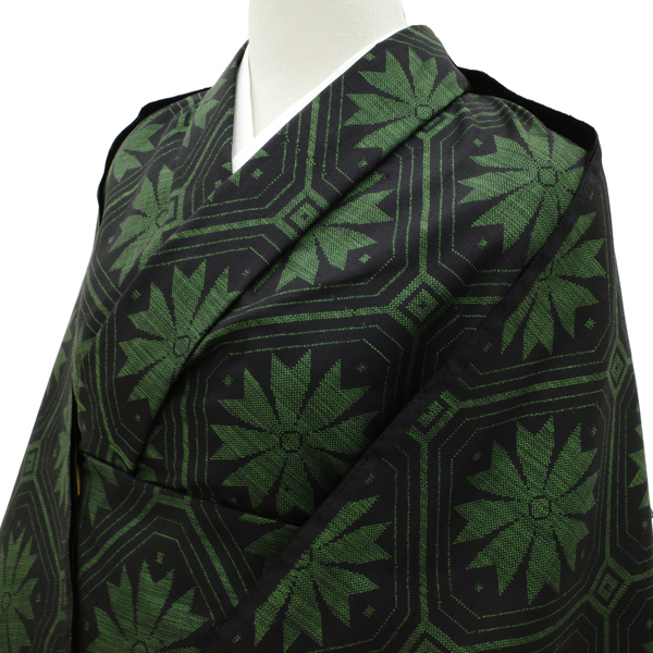黒地に鮮やかなグリーンは大島ではとても珍しく、帯や小物を合わせて ご自分なりの趣味性あふれるコーディネートが楽しめる一枚です。