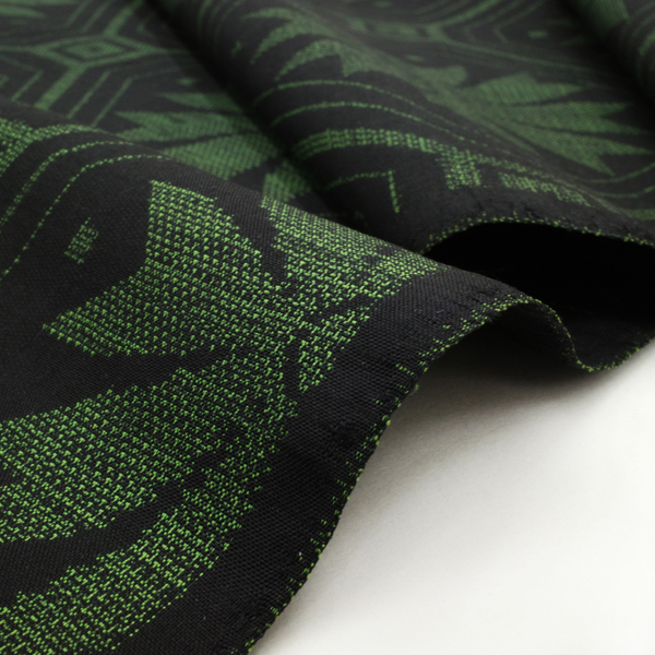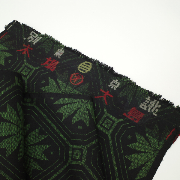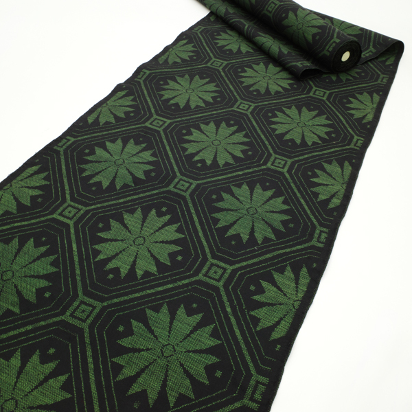 こちらのお品は、黒地にモダンな印象の可愛らしい花蜀江文様がグリーンの絣で表現されております。
