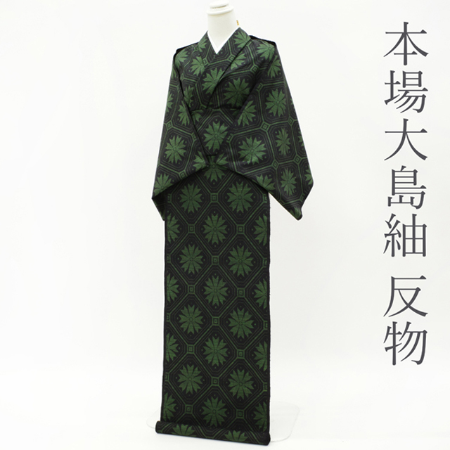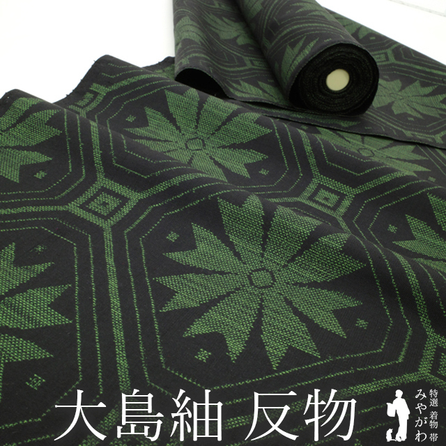 【新古品】 本場大島紬 着尺 着物 反物 9マルキ カタス式 正絹 絹 黒地 ブラック地 緑 グリーン 花蜀江柄 カジュアル ホームパーティー 観劇 コンサートなど リサイクル 販売 購入 未使用 美品 新古品 みやがわ sb11545