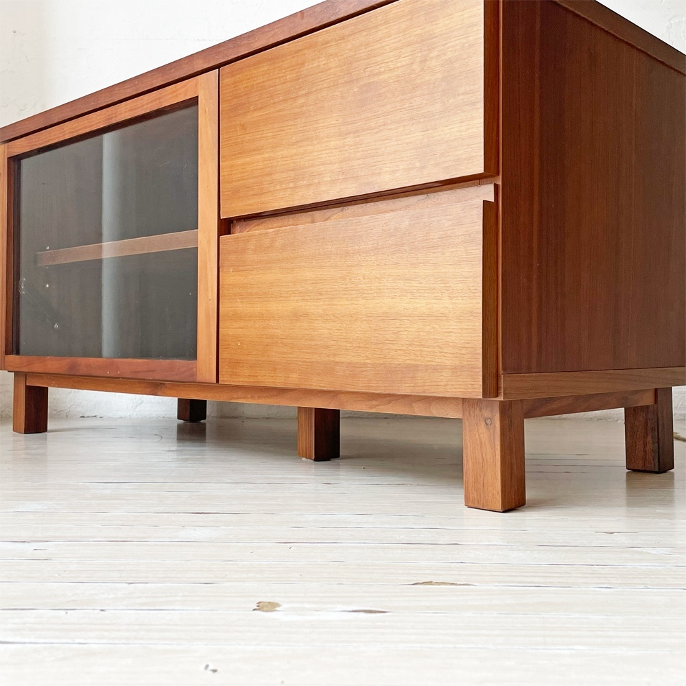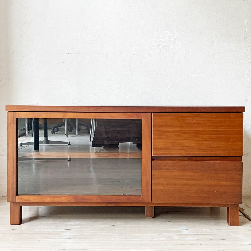 | コメント | シンプル&ナチュラルデザインで、暮らしに溶け込む優しい空気を纏った“無印良品 MUJI”。 素朴さと木のぬくもりを感じられるこちらのAVボード。 こちらは高級感のあるウォールナット材が使用された1点です。 左側にはドロップダウン式のガラス戸。内部の棚板はダボの位置を調整する事で高さの変更が可能です。ダボはネジ式になっておりますので、しっかりとした強度がございます。 右側はウォールナット材の杢目が引き立つ引き出し収納が2杯。 フルオープンレールになっておりますので、奥に仕舞ったものも取り出し易く、スムーズな開閉が出来ます。 シンプルで直線的なデザインは、インテリアスタイルを選ばず設置できるところも魅力的です。 ナチュラルテイストや北欧テイスト等、様々なアイテムと相性が良い一台。 是非、ご検討くださいませ。 ※当ショップは、主にリサイクル品を取り扱っております。基本的にUSED品である事をご理解頂き、ご入札をご検討下さいませ。 |