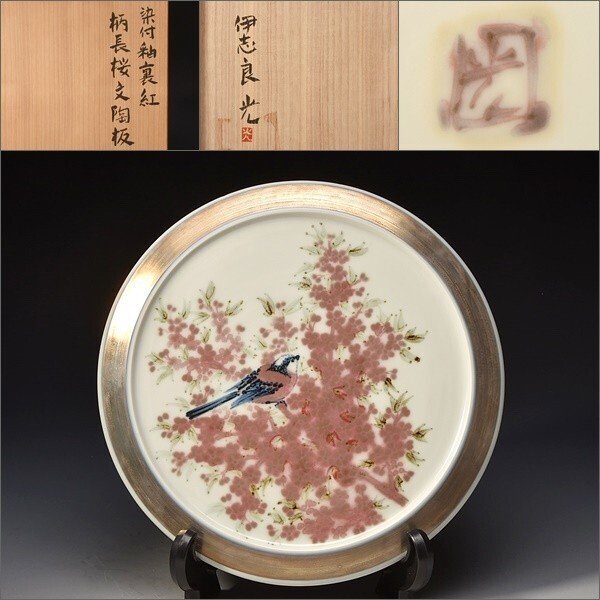 U08028 東京芸大 伊志良光 染付 釉裏紅 柄長桜文 陶板 共箱 /桜