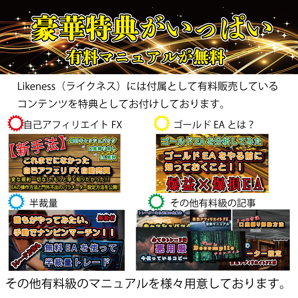 ポジションを取得するのに数秒かかることがあります。 ただナンピンマーチンやスイング、デイトレであれば逆にプラスになる時があるので、結果同じ結果となります。 裁量トレードも同じです。 本マニュアルは初心者の方から上級者の方までご納得頂けるよう丁寧に作っております。 画像を使っての説明の他に、様々な動画コンテンツを用い説明しております。 サポートは無制限にて対応致します。 マニュアル関しての質問はもちろんですが、 直接関係ないご質問でもしっかりと対応致しますので、ご安心下さい。 落札後の返金は出来ません。 | ||||||||||||||||
