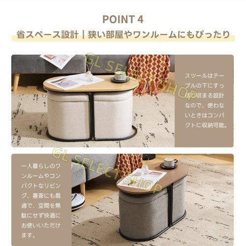 • point03 【省スペース設計|狭い部屋やワンルームにもぴったり】スツールはテーブルの下にすっぽり収まる設計なので、使わないときはコンパクトに収納可能。一人暮らしのワンルームやコンパクトなリビング、書斎にも最適で、空間を無駄にせず快適にお使いいただけます。
