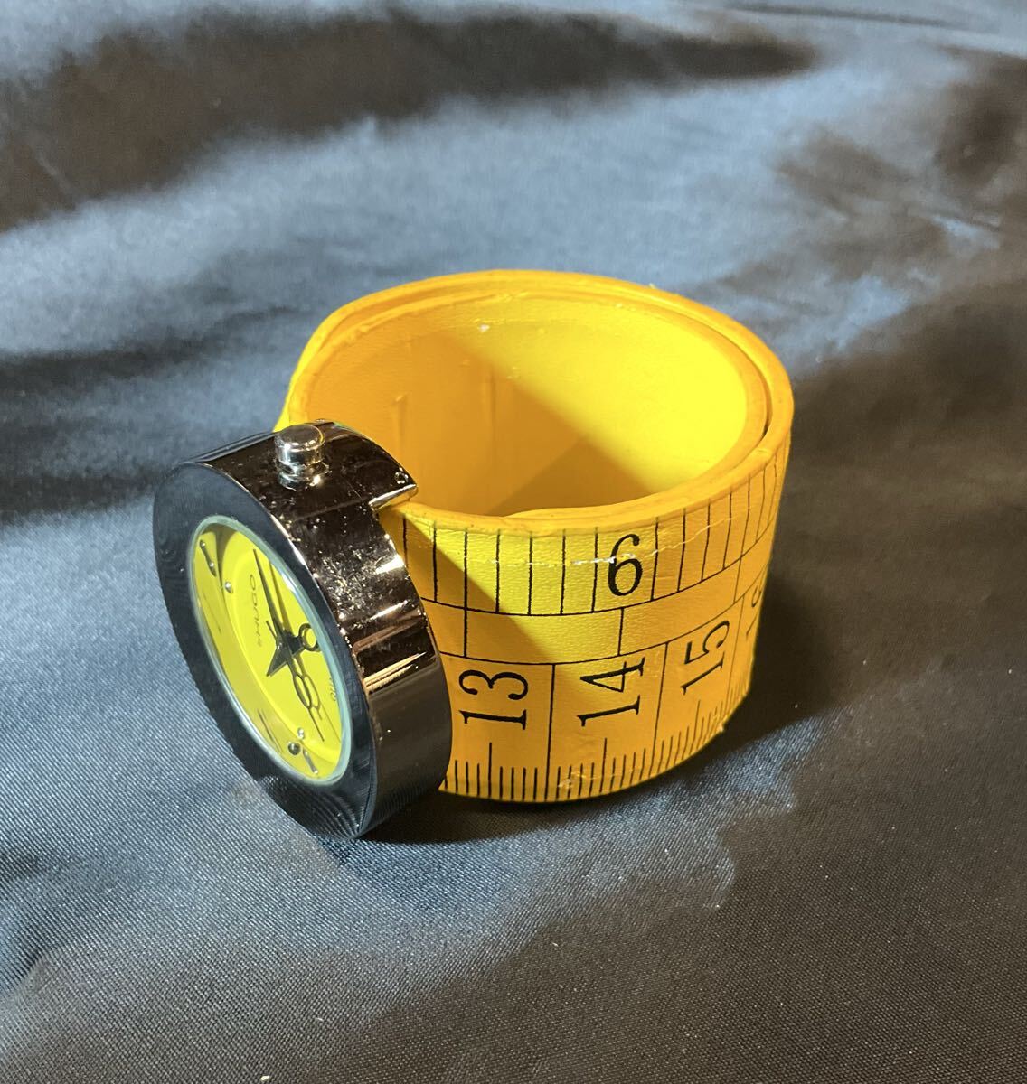 針がハサミの形になっているのもさることながら、ベルトの両サイドがセンチとインチのメジャーになっています。