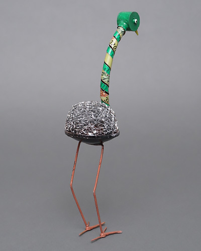 マリ共和国で使用済みの缶や鉄製タワシを再利用し、遊び心ある鳥のフォルムに仕立てたリサイクルアートの置物です。