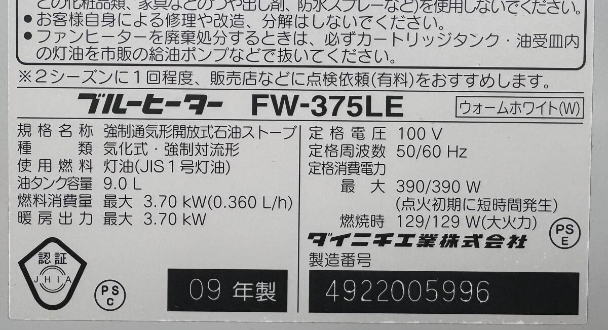 動作品 DAINICHI ダイニチ 2009年製 石油 ブルーヒーター FW-375LE 木造〜10畳, コンクリート〜13畳 ウォームホワイト 福岡市