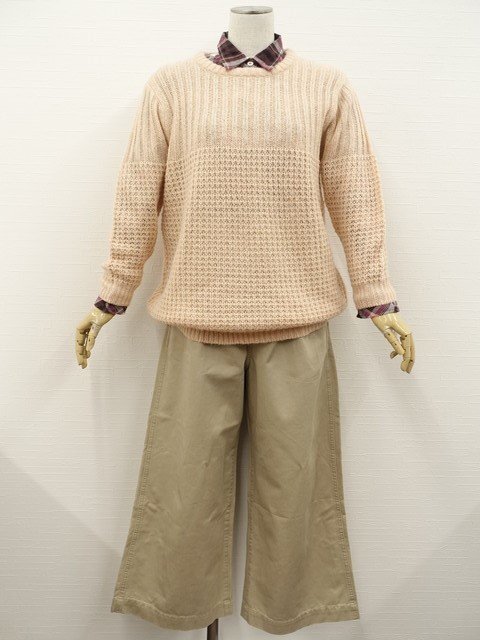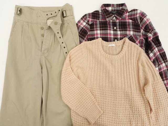 洗える長袖ニットセーター+長袖シャツ+ツータックチノワイドパンツ コーディネート上下3点セット M相当 ピンク系/ピンク×ブラウン×ホワイト チェック柄/ベージュ ガーリー