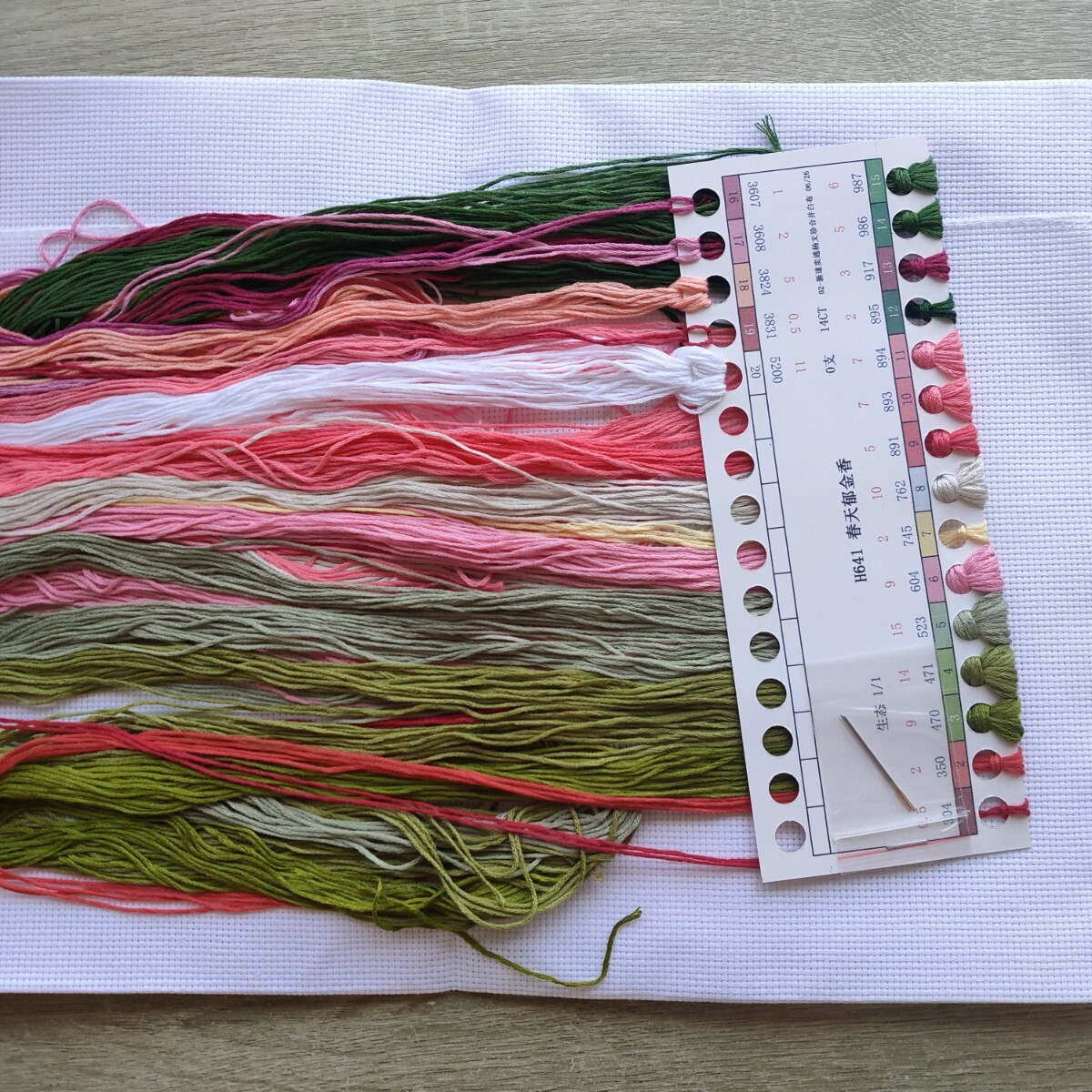 刺繍糸は余分に見積もって入っていますが、製作中もし足りなくなった場合は、ご自身でご用意ください。DMCの糸番号に対応しています。検品のため1度開封しています。
