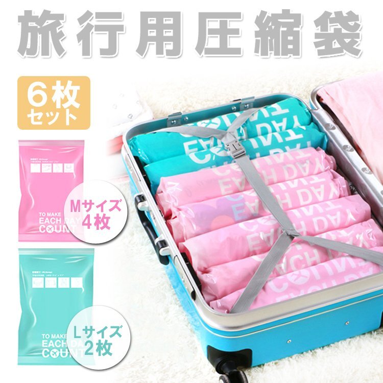 ◆旅行用圧縮袋 6点セット 衣類圧縮袋 サイズM4枚 L2枚 トラベル圧縮袋 掃除機不要 巻くだけ 旅行 出張 引っ越し 衣替え クローゼット整理 省スペース 衣類収納袋 TSTRG06S