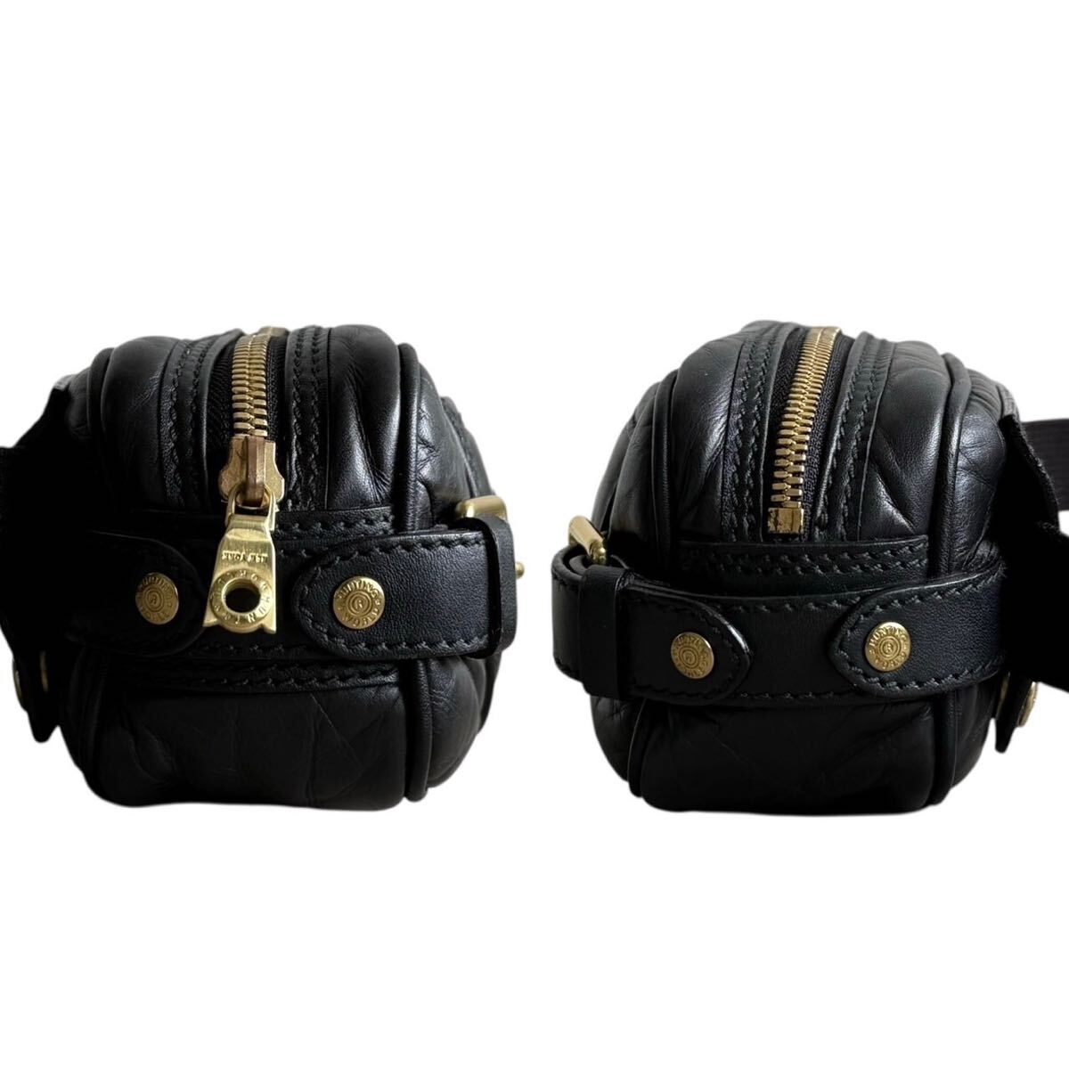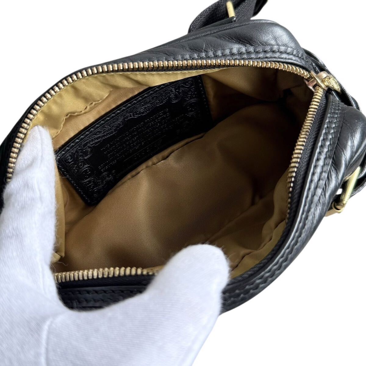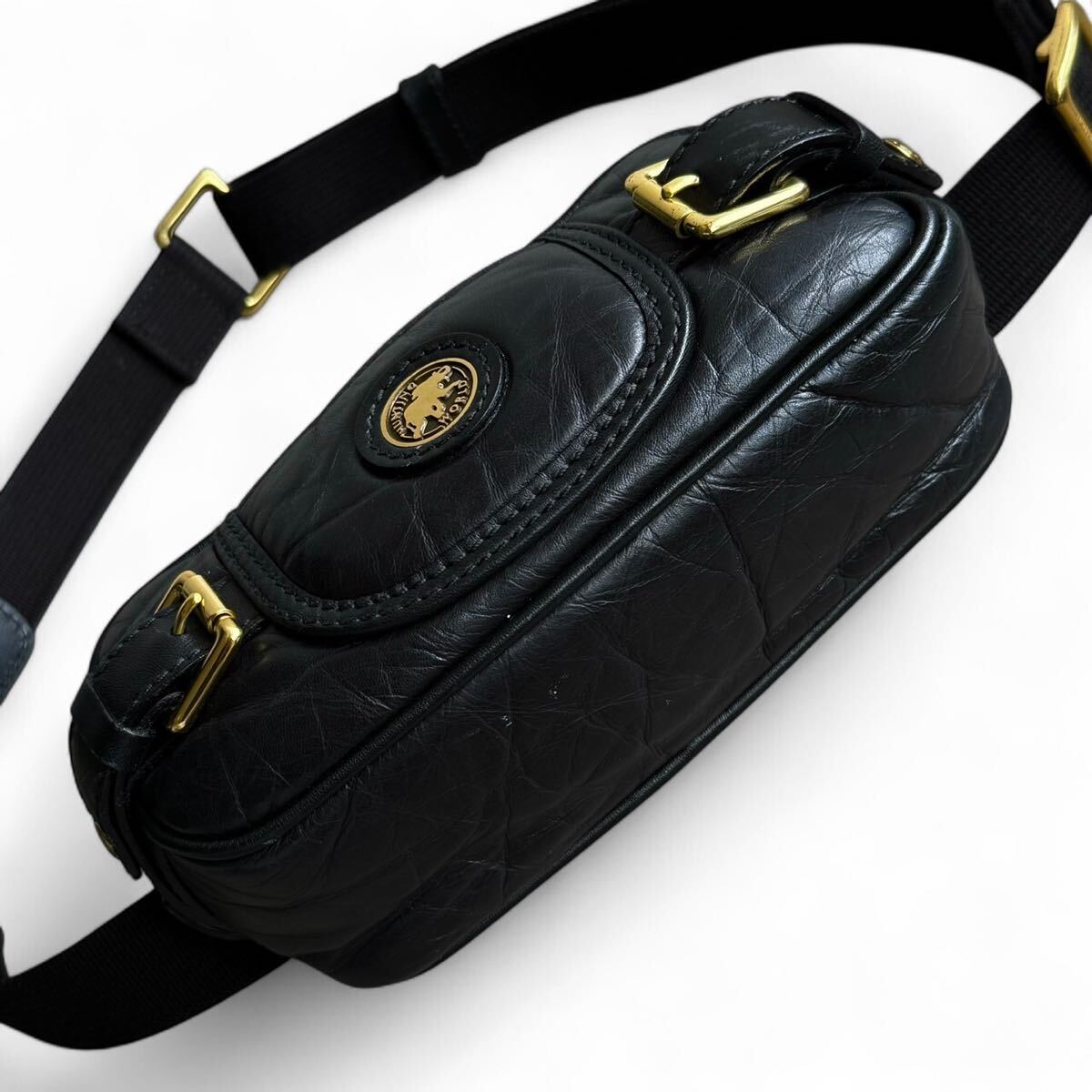 やや使用感はございますが、特に目立つスレや汚れもなく全体的に極美品。品格ある大人の装いに寄り添う、末永く愛用できる逸品です。どのシーズンでも活躍するブラックレザーのボディバッグをお探しの方に、自信を持っておすすめいたします。