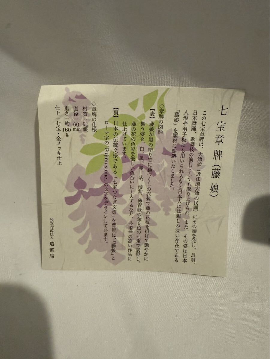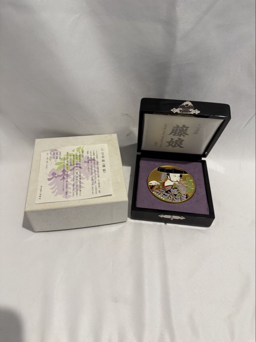 造幣局が製作した七宝章牌シリーズの一つ「藤娘」です。日本舞踊「藤娘」を題材に、黒の衣装に藤の花をあしらった優雅な立ち姿を七宝で色鮮やかに表現した作品で、白・黒・赤紫・黄・緑など全6色の七宝を贅沢に用いた芸術性の高い記念章牌です。