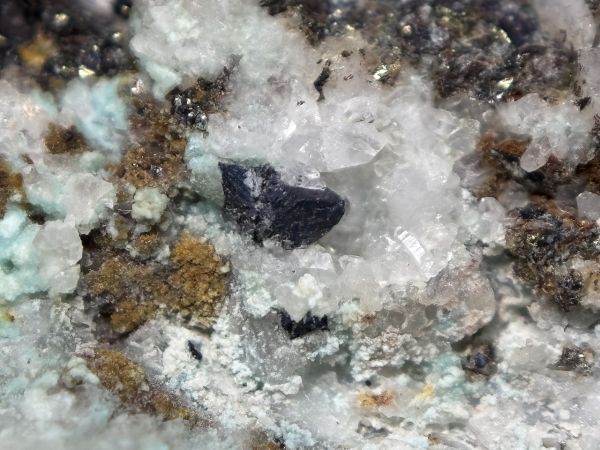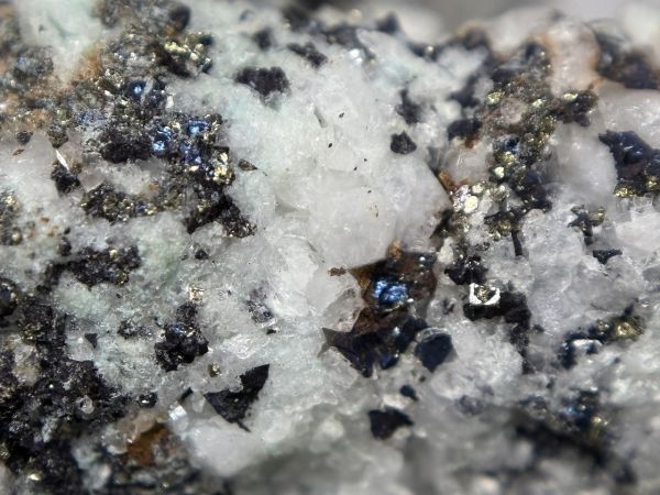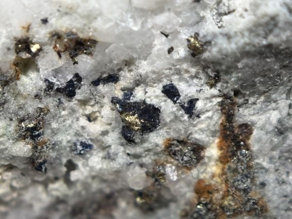 黄銅鉱・銅藍です。黄銅鉱を主体とする銅鉱石で、一部に二次的な銅藍が生成しております。