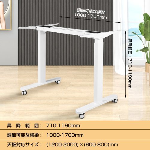 • 1. 【基本情報】昇降範囲:720-1200mm;調節可能な横梁:1000-1700mm;天板対応サイズ:(1200-2000)*(600-800)。この製品には天板が付属しておらず、必要な天板のサイズを自由に選択できます。昇降音は50デシベル未満で、静かな昇降音のため、夜間でも使いやすいです。負荷耐久力は最大70kgで、二段式の脚立構造を採用し、安定して丈夫です。