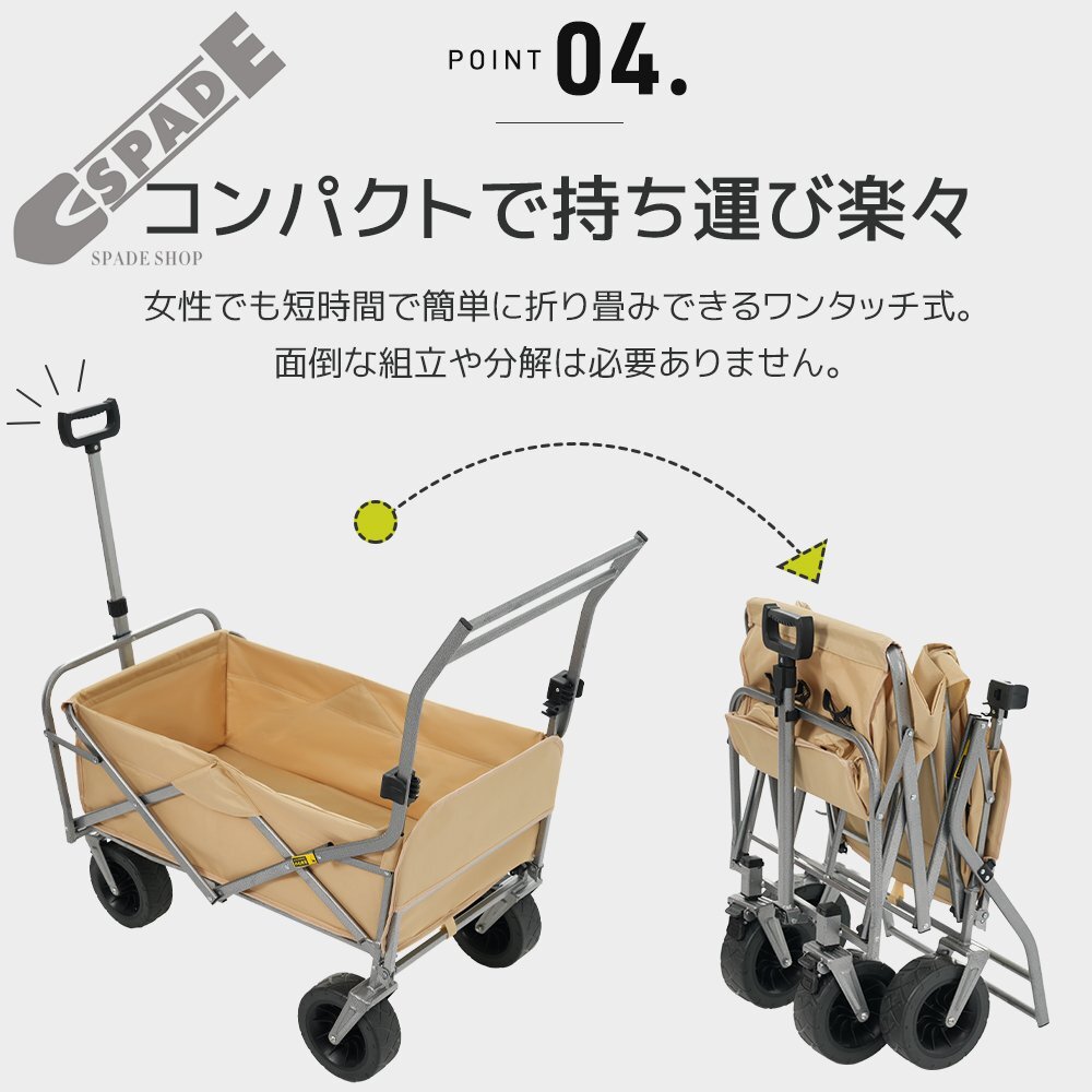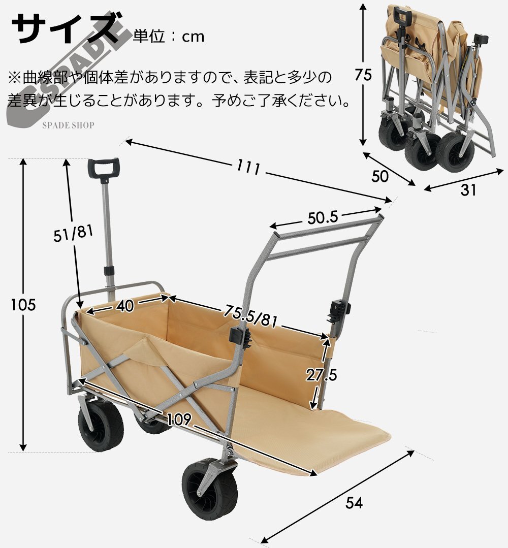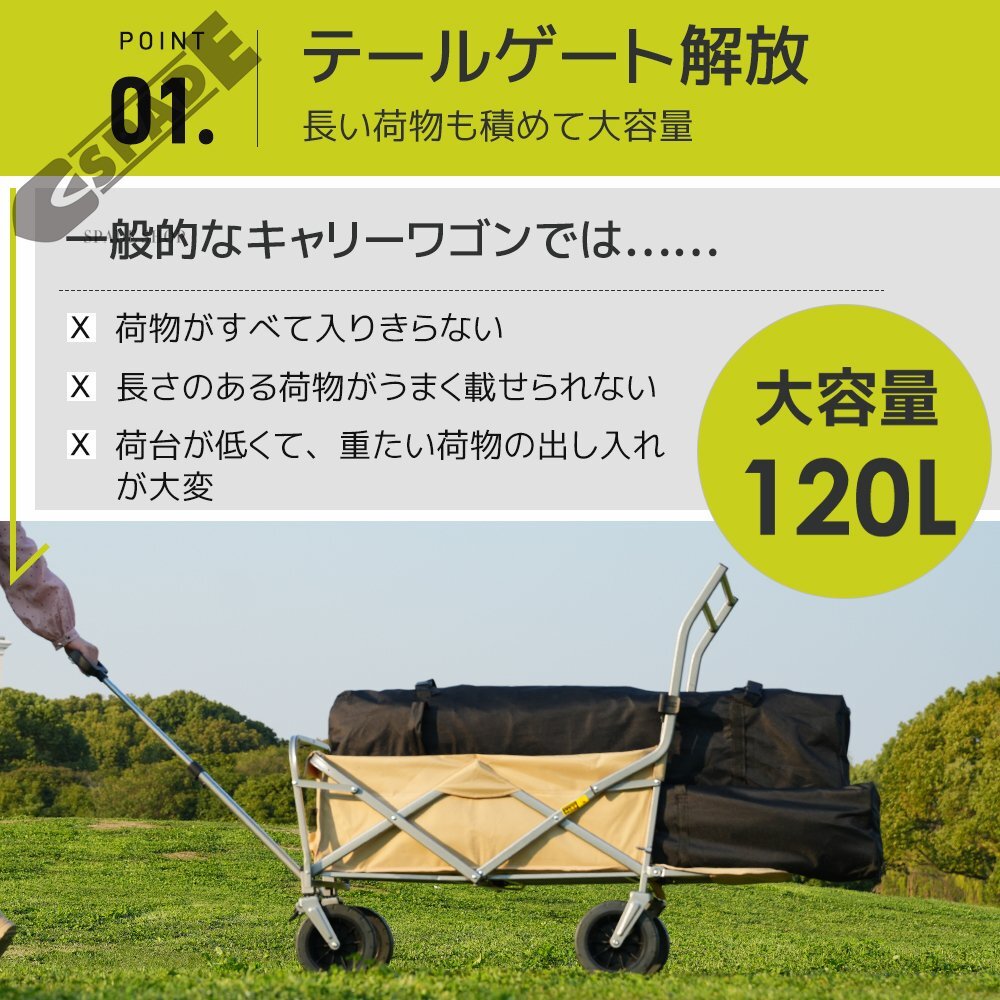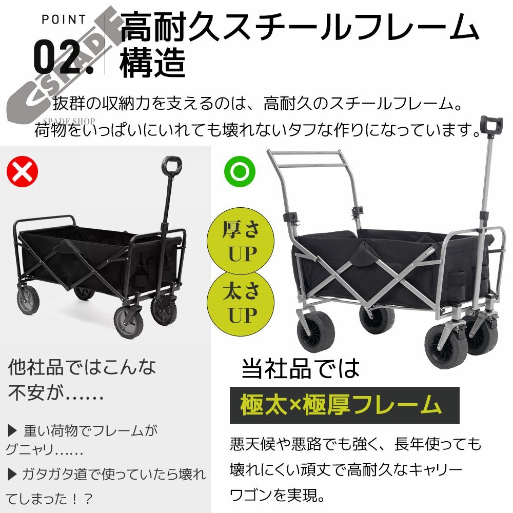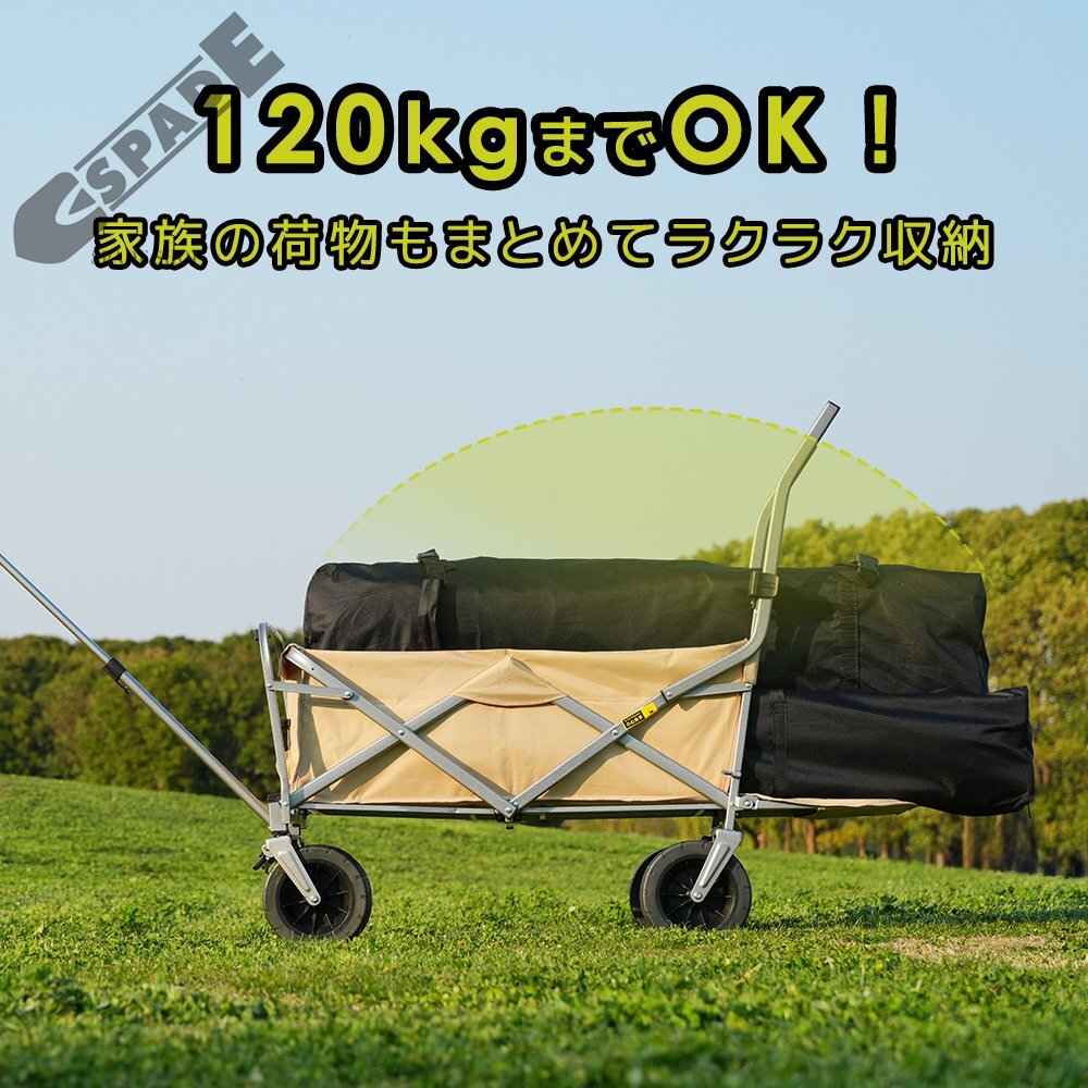 • 【高耐久スチールフレーム構造】抜群の収納力を支えるのは、高耐久のスチールフレーム。荷物をいっぱいにいれても壊れないタフな作りになっています。当社品では極太×極厚フレーム 太さUP   厚さUP 悪天候や悪路でも強く、長年使っても壊れにくい頑丈で高耐久なキャリーワゴンを実現。120kgまでOK! 家族の荷物もまとめてラクラク収納 収納ネット付き、小さい物を入れることができます。