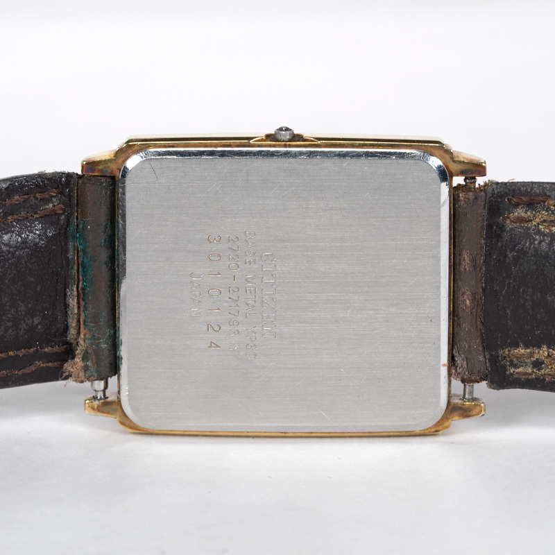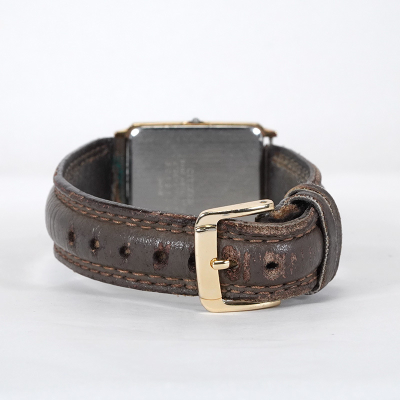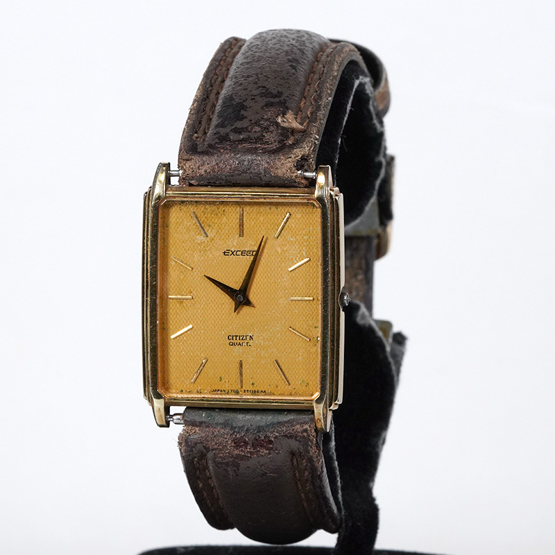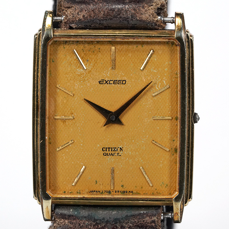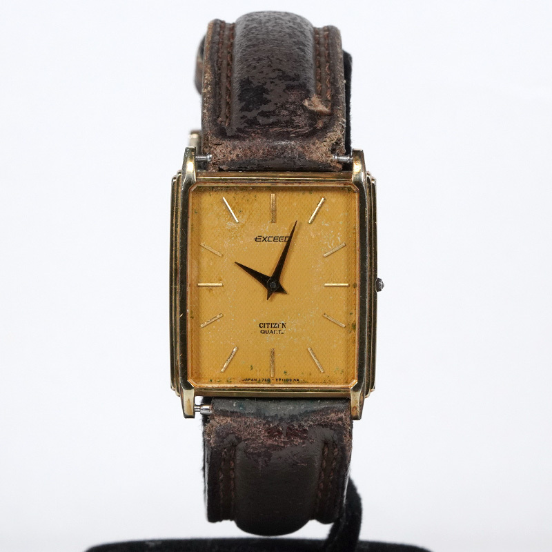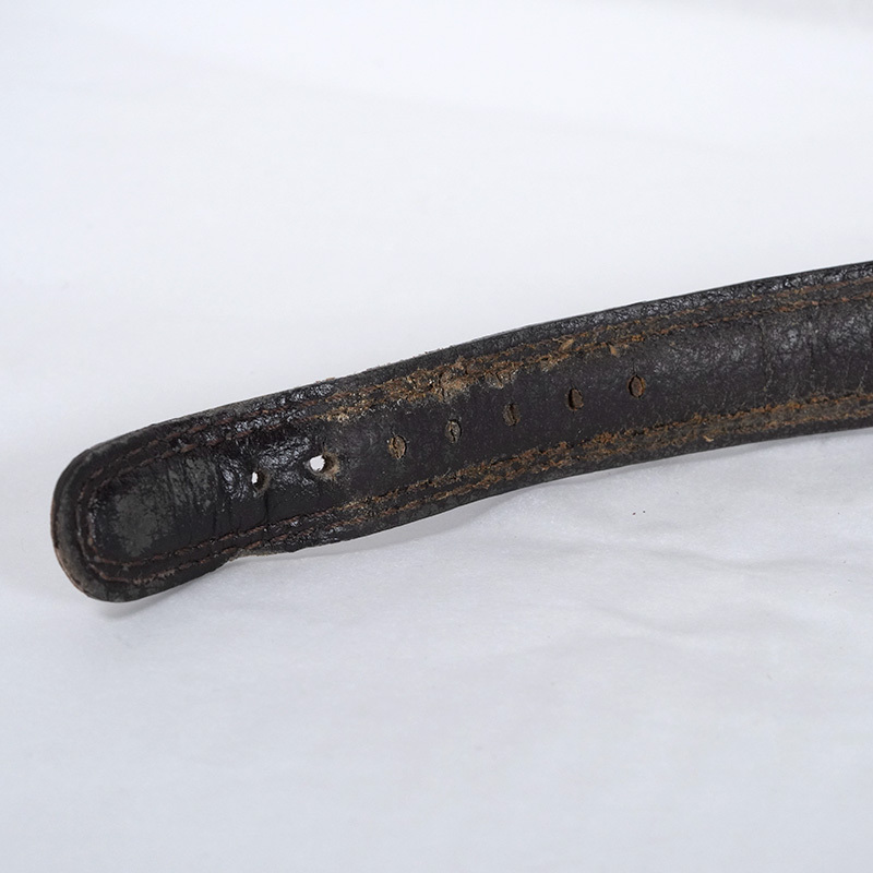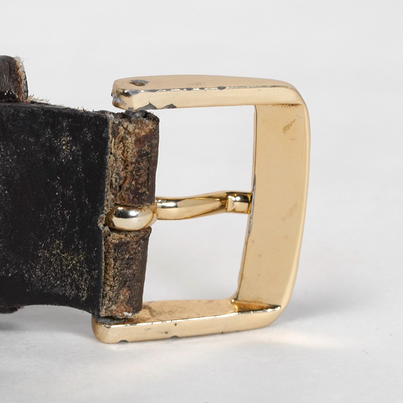 全体的に傷があり、ケースには打痕もございます。 風防の3時と10時の位置に傷が見られます。 文字盤内全体に腐食や緑青が見受けられ、また文字盤に書かれている文字が一部掠れております。 ベルトと尾錠は社外品で、汚れが詰まっていたり縫い目がほつれていたりと使用感がございます。 リューズ部分が紛失しているため、時間調整が不可能です。 その為、2025年9月に電池交換済の稼働品ですが、ジャンクとしてお考えください。 | |||