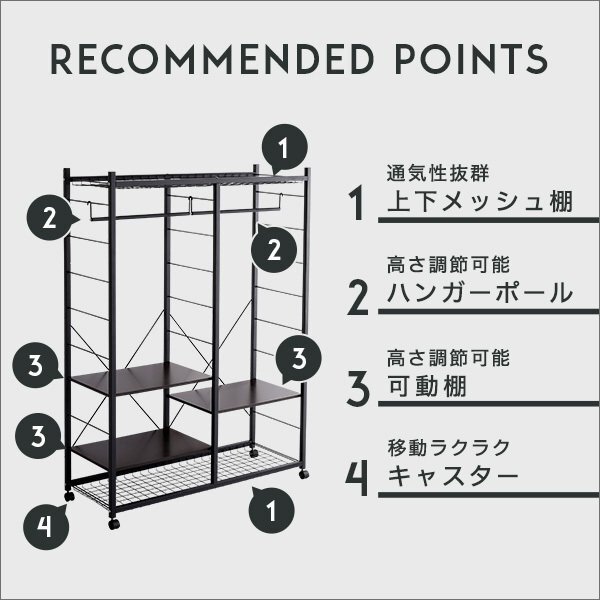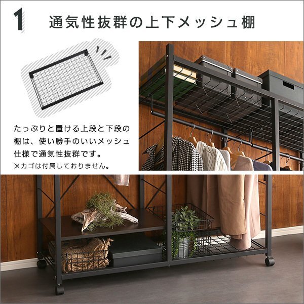 | 【ポイント】 木の温かみとブラックスチールの美しいコントラストが映えるデザインハンガーラックです。 お部屋にお洒落なアクセントが欲しい、衣類の収納にこだわる方へ特にオススメです。 通気性抜群上下メッシュ棚・高さ調節可能ハンガーポール 可動棚・移動楽々ストッパーキャスター付き。 ポールと棚板は簡単に外せて自由に付け替え可能です。 高さ調節可能なので子供部屋からおしゃれリビングまで 自由自在に使えます。 |