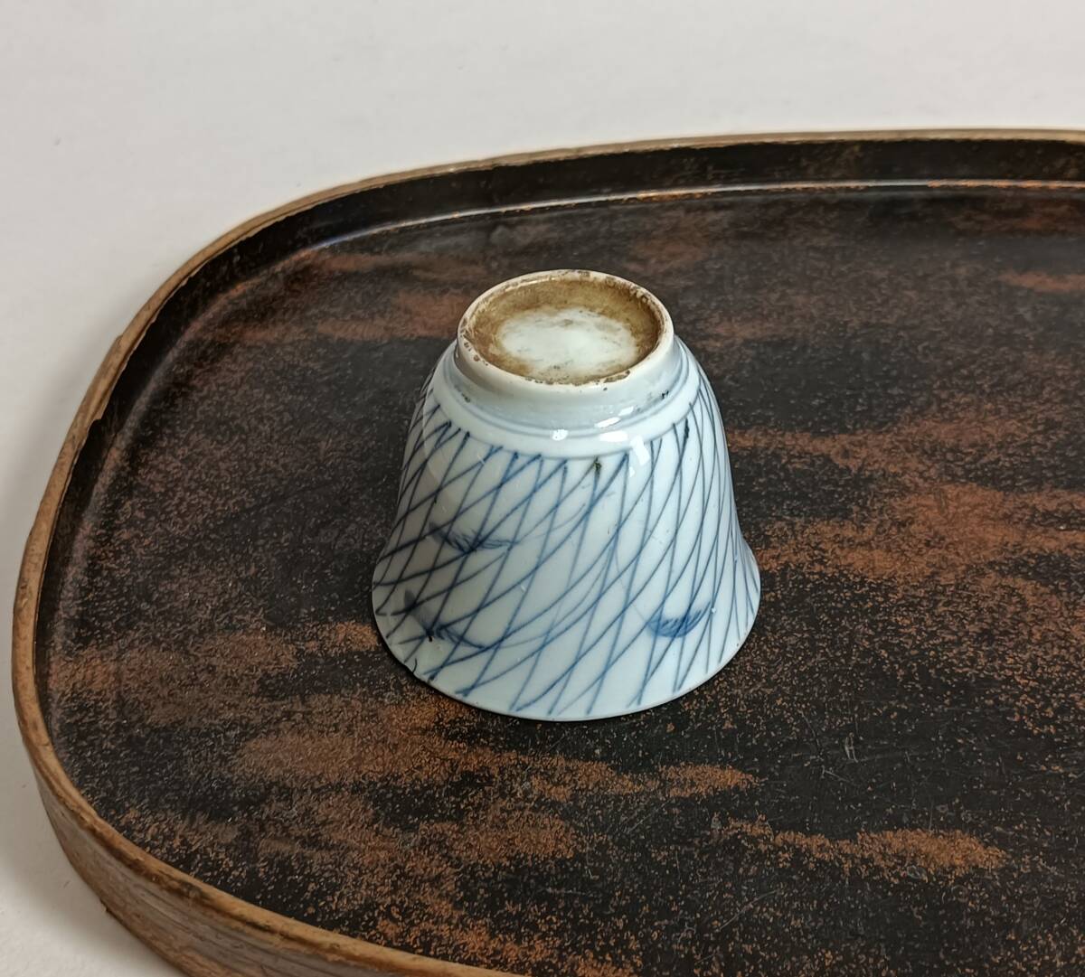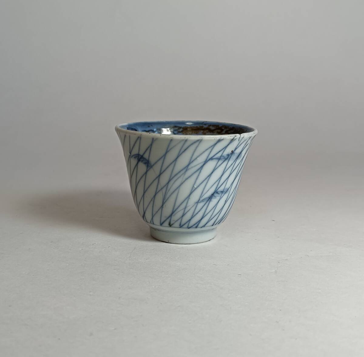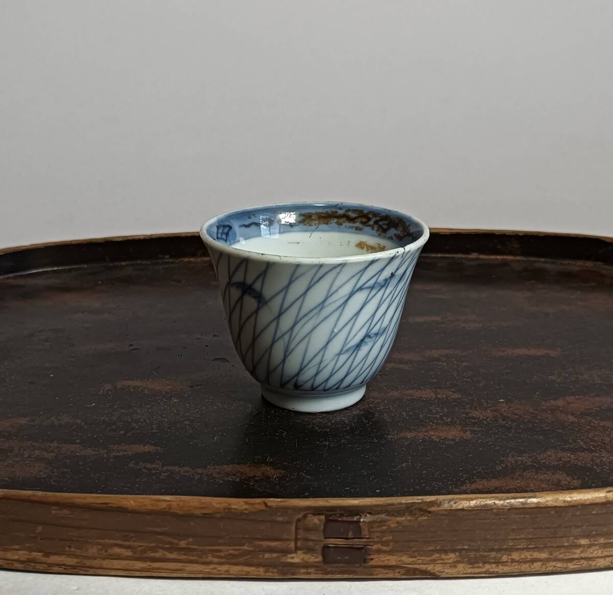 18〜19世紀の古伊万里のススキ文盃です。高台に古い小さいソゲがあります。ニュウはありません。内側の文様も洒落れています。寸法程良く、酒器になってくれそうな古伊万里です。ススキ文が秋の気配を感じさせてくれます。今時季に使うにうってつけの良い文様です。風にススキのなびく様が小さな器の外側いっぱいに巡らせてあり健気なコです。酒盃に使ってあげて下さると器も悦ぶと思います(^^)