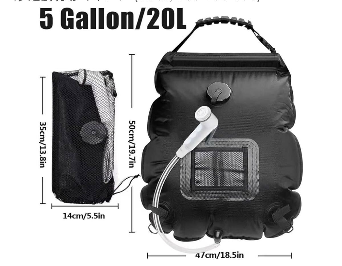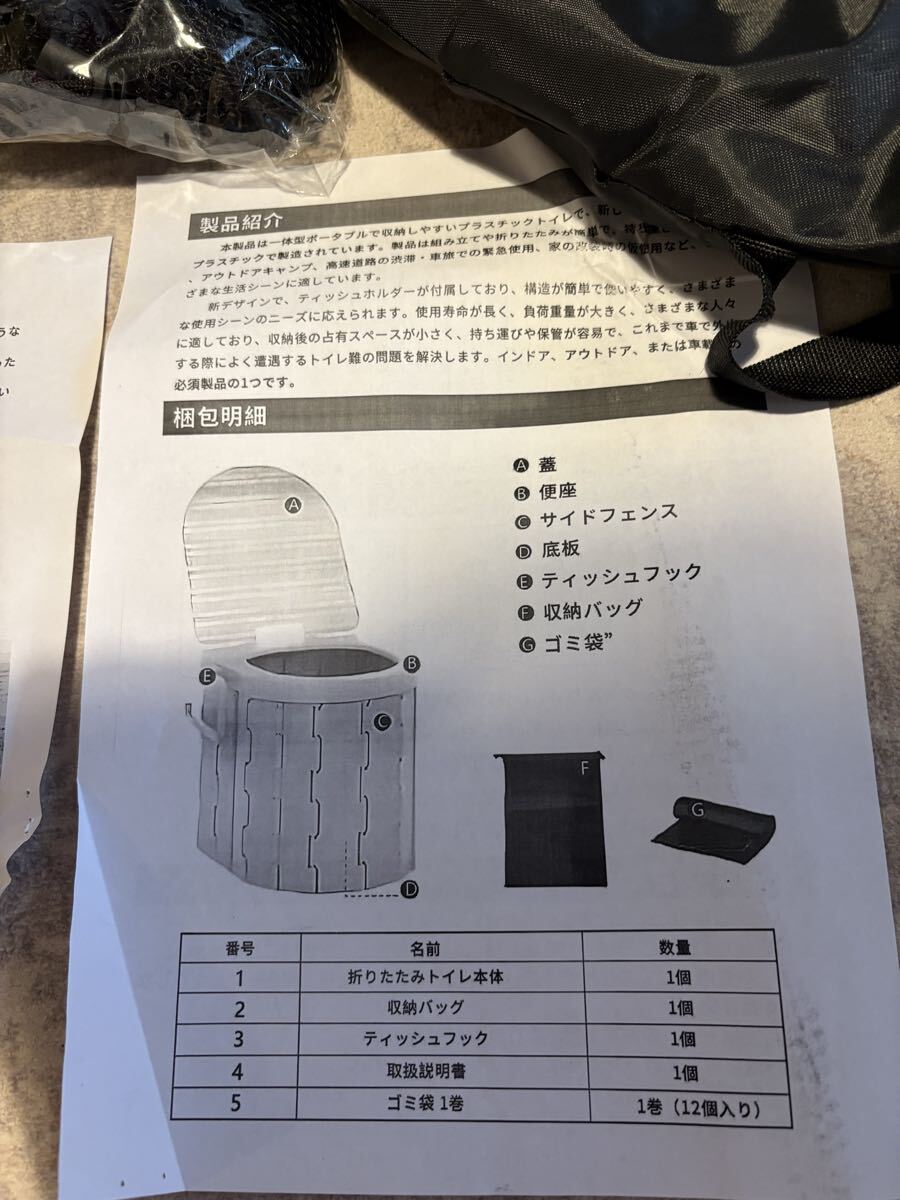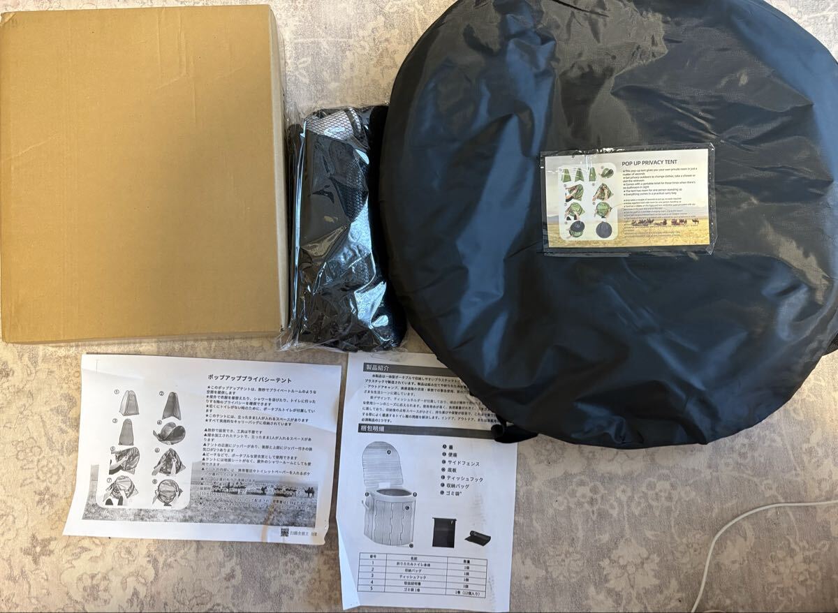 テント ×1、折りたたみ式トイレ ×1、20Lソーラーシャワーバッグ ×1、シャワーヘッド ×1、ホース ×1、キャリーバッグ ×1、ペグ ×4、風防ロープ ×4、処理袋 ×12枚(凝固剤はついてません)