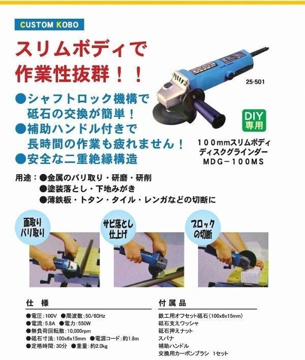 スリムボディで作業性抜群のディスクグラインダーです。 【特徴】 ●補助ハンドル付きで長時間の作業もラクラク! ●シャフトロック機構で砥石の交換が簡単! ●安全・安心の二重絶縁構造 【用途】 ●金属のバリ取り・研磨・研削 ●塗装落とし・下地磨き ●薄鉄板・トタン・タイル・レンガなどの切断に 【仕様】 ●DIY用電動工具 ●電圧:100V ●周波数:50/60Hz ●電流:5.8A ●消費電力:550W ●無負荷回転数:10000min-1 ●定格時間:30分 ●コードの長さ:約1.8m ●重量:約2.0kg ●二重絶縁構造 【付属品】 ●鉄工用オフセット砥石(100x6x15mm) ●砥石支えワッシャー ●砥石押さえナット ●スパナ ●補助ハンドル ●交換用カーボンブラシ1セット メーカー:株式会社三共コーポレーション ※土、日、祝日、盆(8/13~8/15)、年末年始(12/29~1/5)の発送、連絡業務は行っておりません。 ※発送、連絡、質問等にお答えできるのは上記以外の10時~17時までとなっております。 | ||||||||||||||||