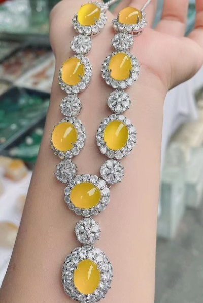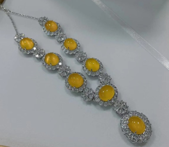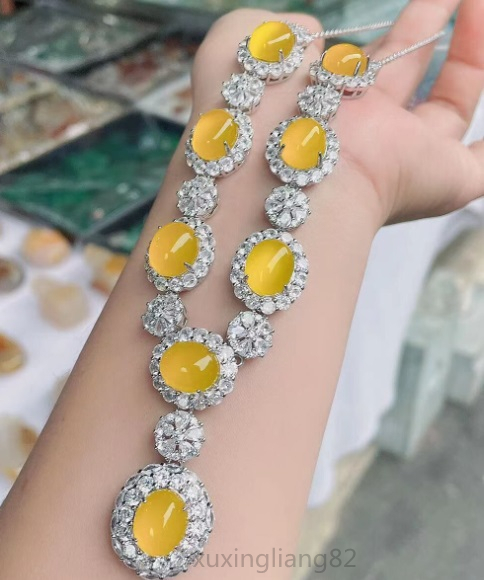 美しく輝く ブラジル産 天然氷種黄玉髄 ネックレス 満々ジルコン ピカピカ メッキ アクセサリー