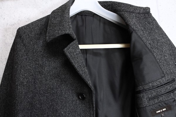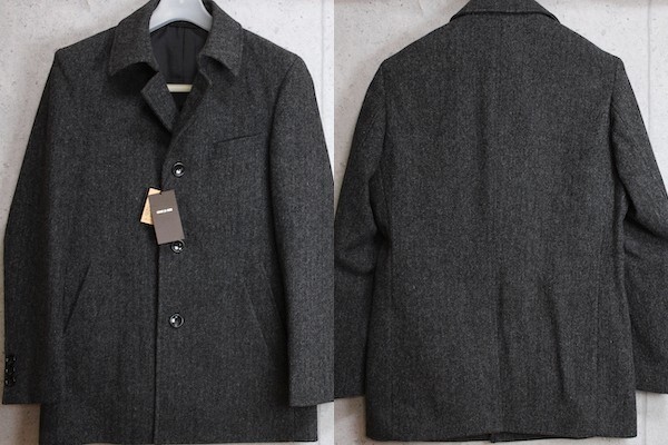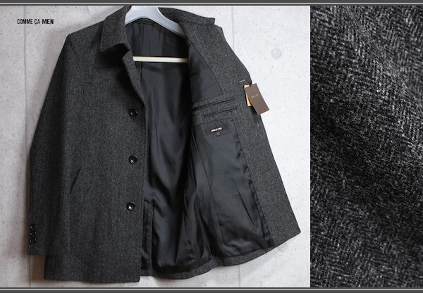 コムサ系のメインブランド、コムサメン(COMME CA MEN) PLATINUM MODELの英国羊毛 ヘリンボーン ツイード ナポレオンカラー ハーフ コート。