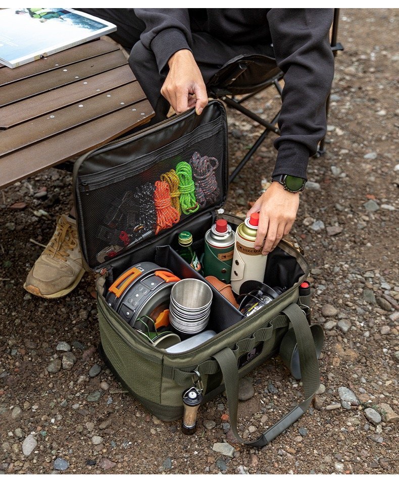 20Lの容量があるため、ランタンや焚火台、ペグ等、キャンプに必要なものを沢山収納可能。