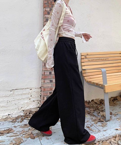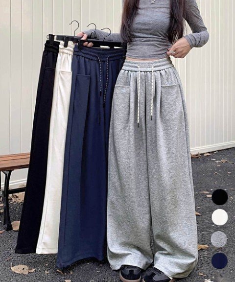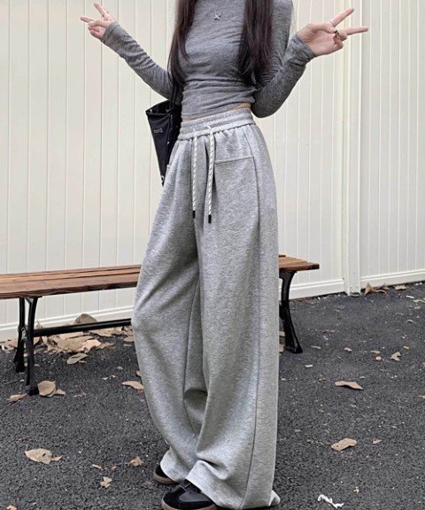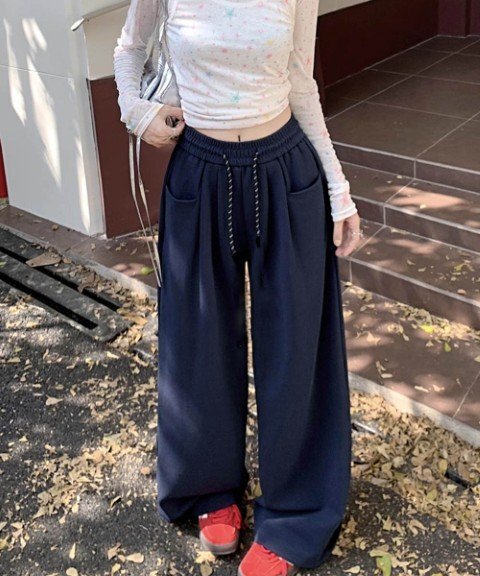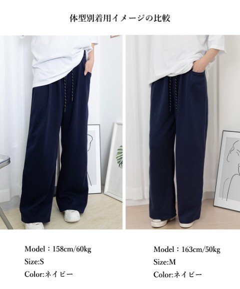 リラックス感のあるワイドシルエットと、ウエストのドローストリングデザインが特徴のカジュアルボトムス