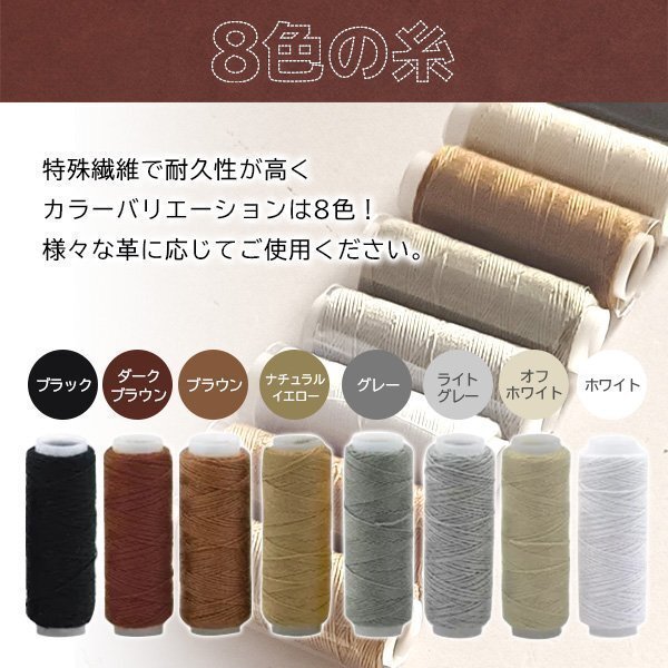 【8色の糸】特殊繊維で耐久性が上がり、糸8色あり、様々な革に応じてご使用ください。