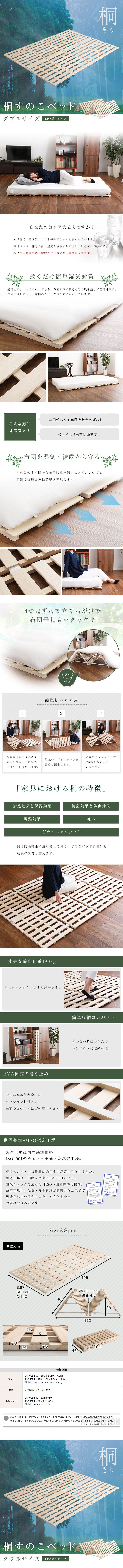 | 【ポイント】 通気性バツグンのすのこベッドです。 材質はすのこベッドにおける最良の桐材を使用しました。 頑丈な耐荷重180kgです。 布団も干せる4つ折りタイプです。 |