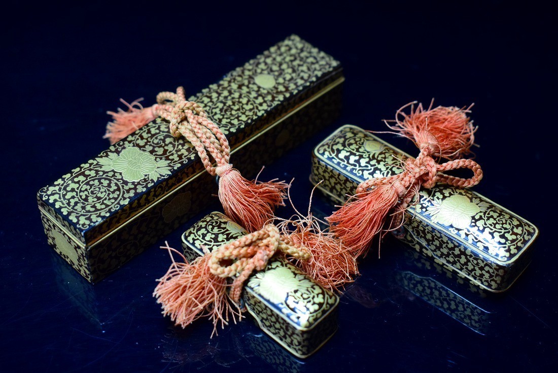 古い雛道具 牡丹唐草金蒔絵 短冊箱 書状箱 箱物 三点 ひな道具 F1050 |