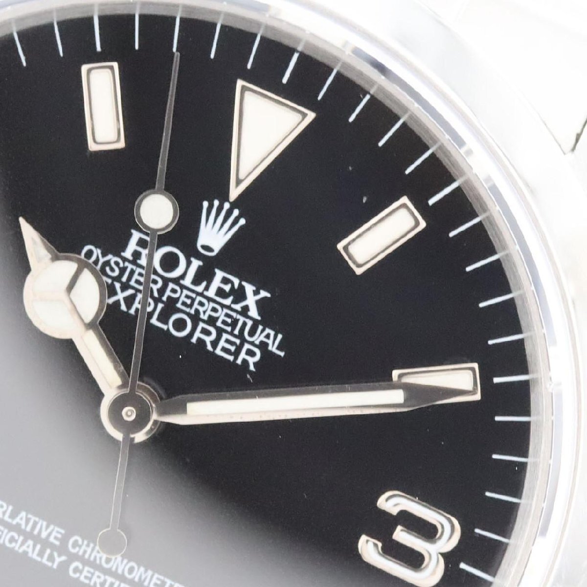 1990年頃に登場し、2001年頃まで生産されたエクスプローラーI、型式「14270」。風防がプラスチックからサファイアクリスタルへ変更され、アワーマーカーにホワイトゴールドの縁取りが採用されるなど、現代的な仕様となった世代です。象徴的な「3・6・9」インデックスはそのままに、高級感と視認性が向上しました。ムーブメントには、当時のサブマリーナーデイト無しにも搭載された信頼性の高い自動巻き「Cal.3000」を搭載。ケース径36mmの不変的なデザインで高い人気を誇る一本です。
