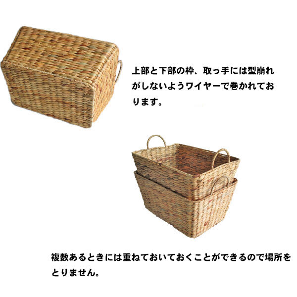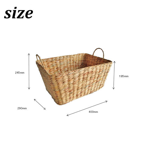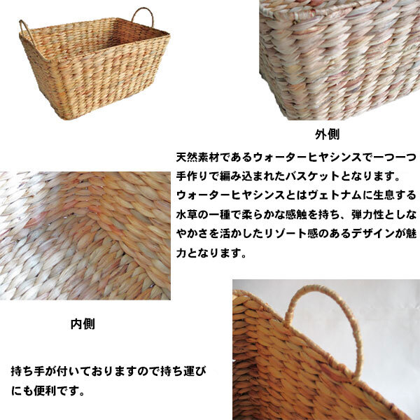 | 商品説明 | 天然素材であるウォーターヒヤシンスで作られたバスケットです。 ウォーターヒヤシンスとはヴェトナムに生息する水草の一種でやわらかな感触を持ち、弾力性としなやかさを活かしたリゾート感あるデザインが魅力となっております。 ハンドメイドのため一つ一つ色合いやサイズが多少異なることがありますのでご了承ください。 複数あるときには重ねておくことができます。 |