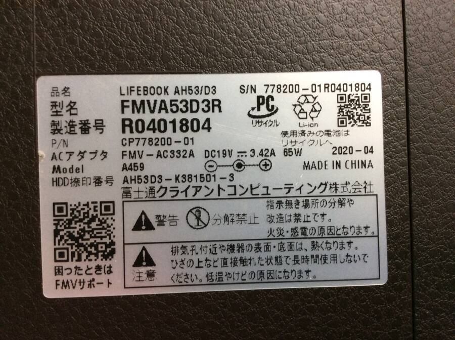 FUJITSU FMVA53D3R LIFEBOOK AH53/D3 Core i7 8565U 1.80GHz■ジャンク品
