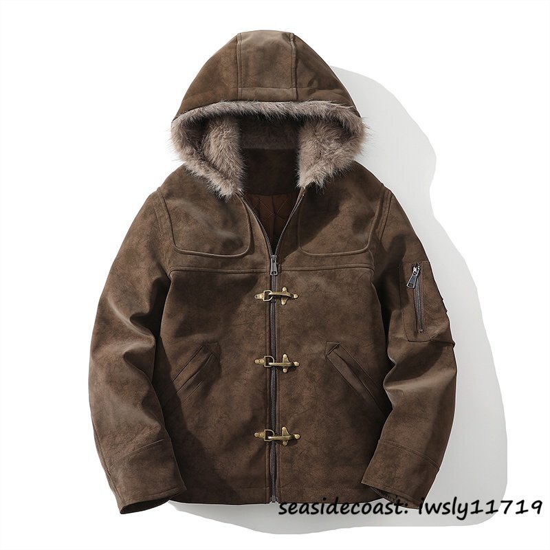 定価13万◆ムートンコート 秋冬新品 フード付き メンズ 保温 防寒 厚手 ダウンジャケット ファーコート ライダース ブルゾン 珈琲色 XL