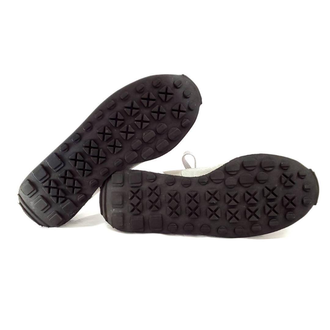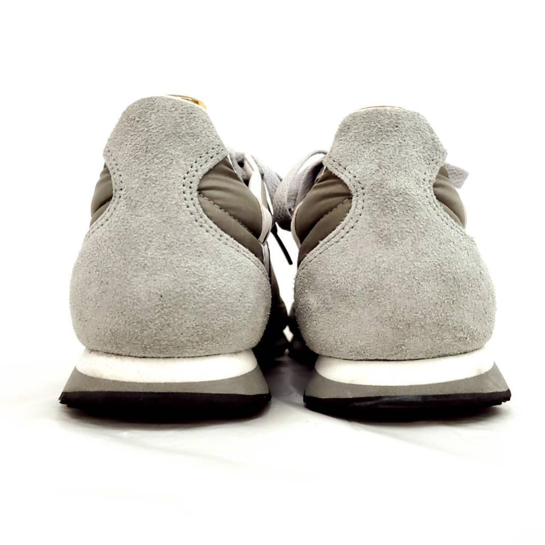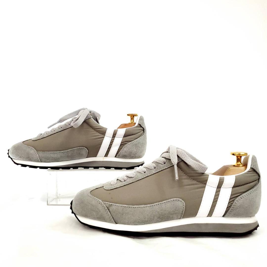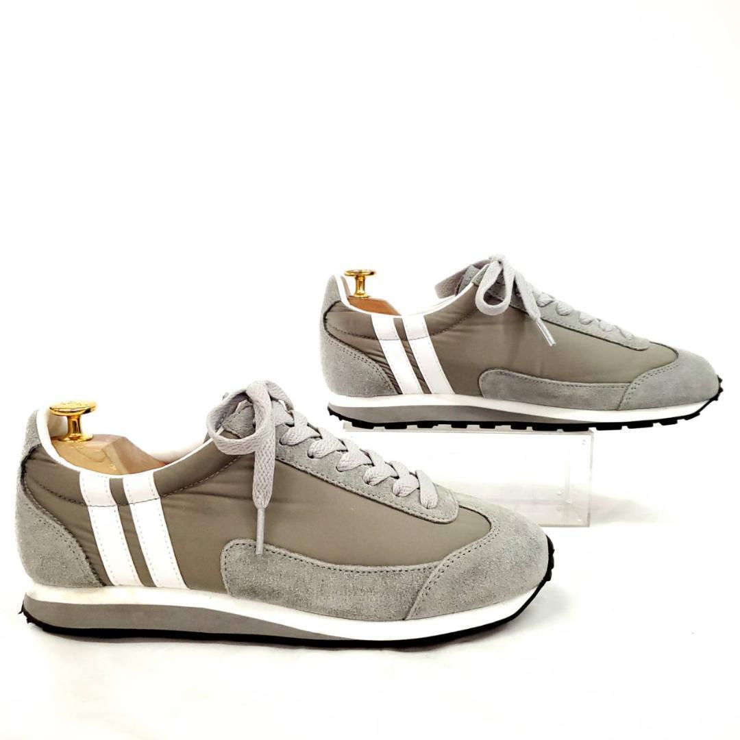 落ち着いたグレーにホワイトのラインが映える、シンプルながら存在感のある一足です。