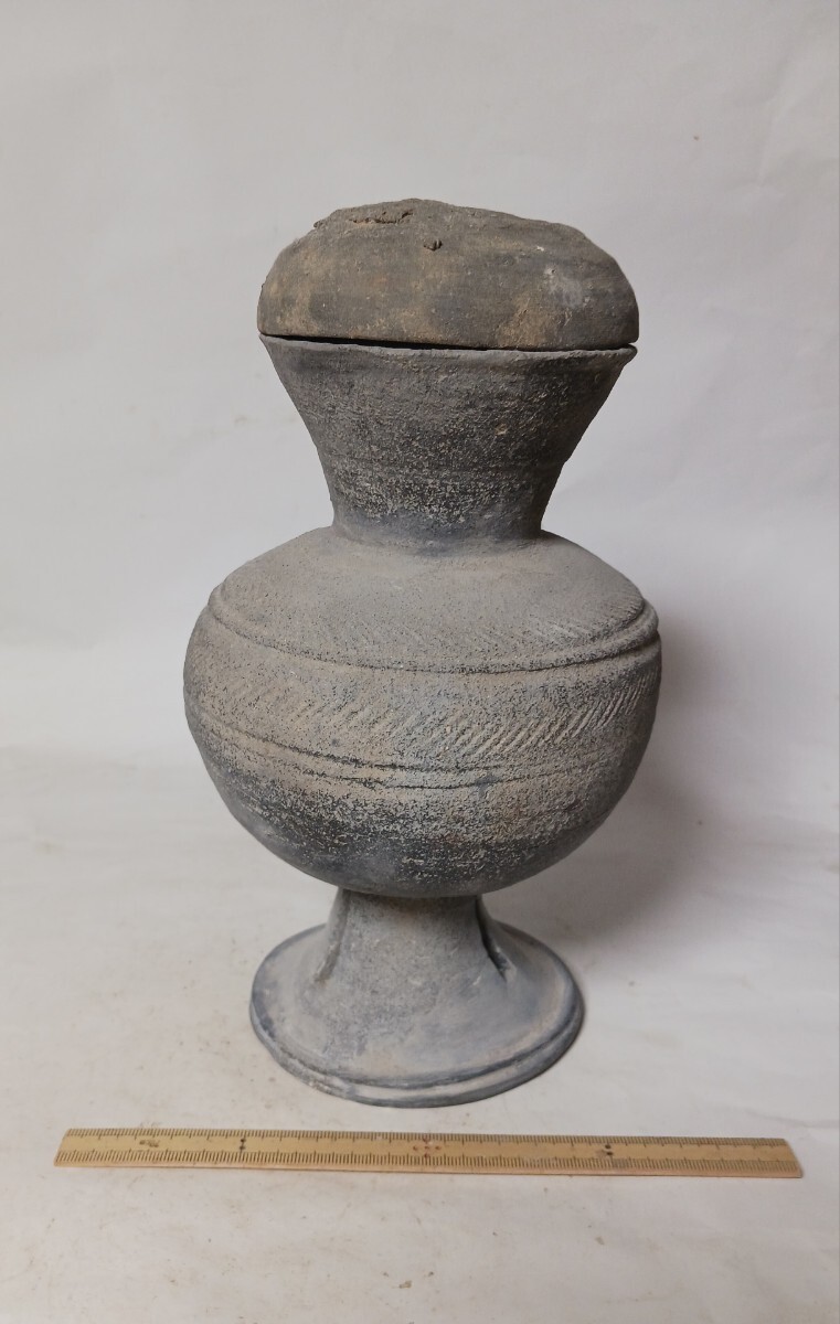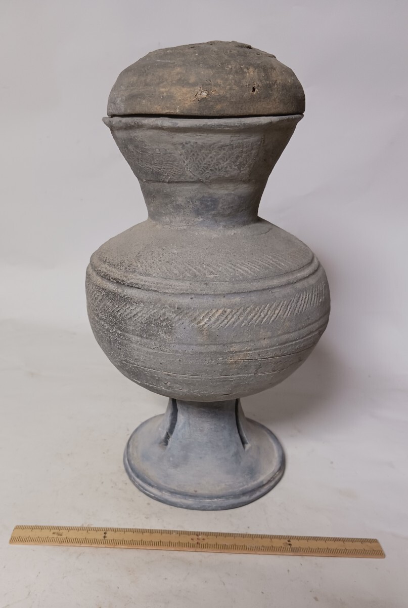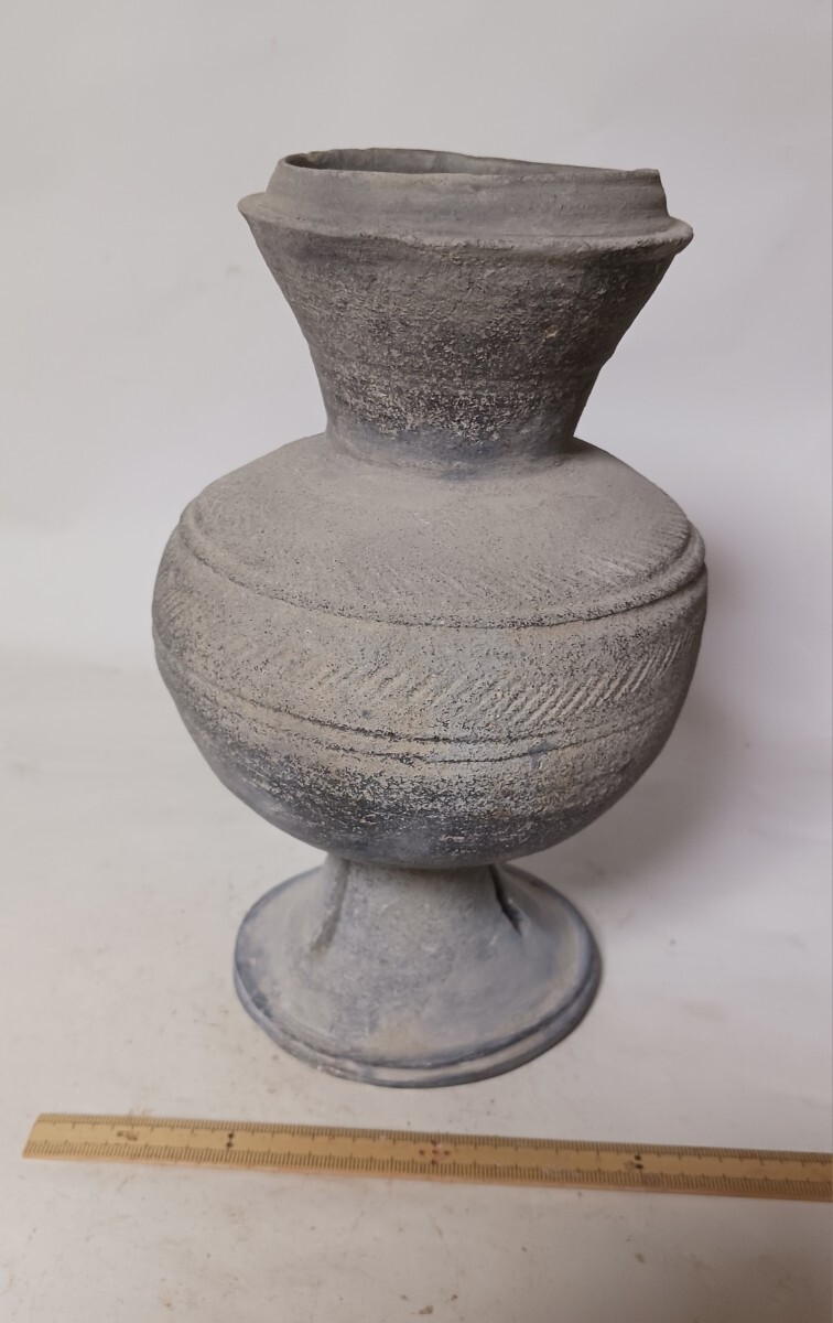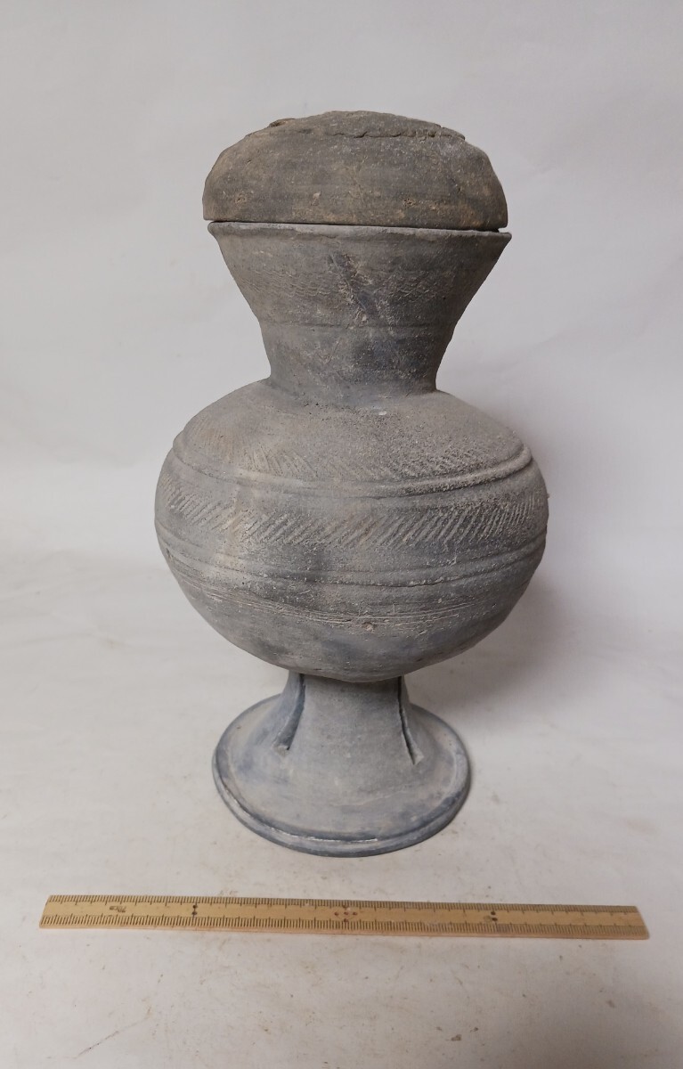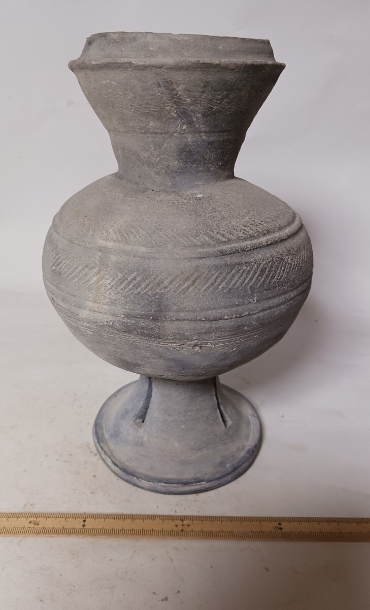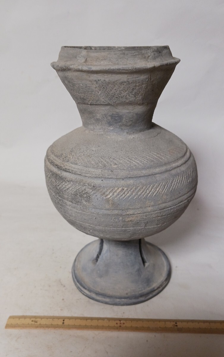 胴部に割れ、口縁部および台部に小さな欠損があったようですが、うまく補修されています。部品としては90%以上がオリジナルです。時代的には、6世紀頃のものでしょうか。以上の説明内容をご承知の上で入札お願いします。各部の大きさは写真のスケールでご確認ください。