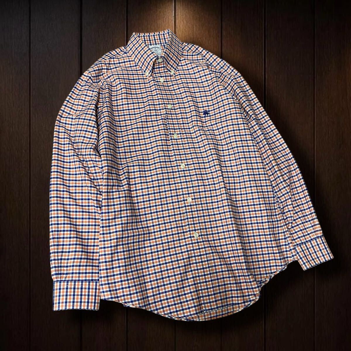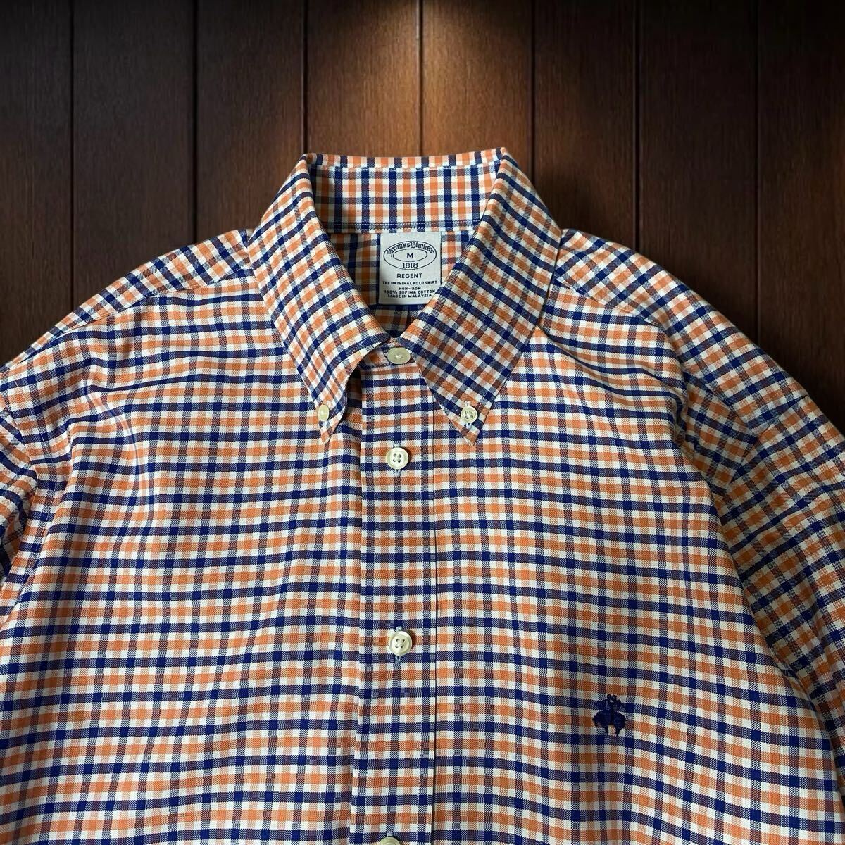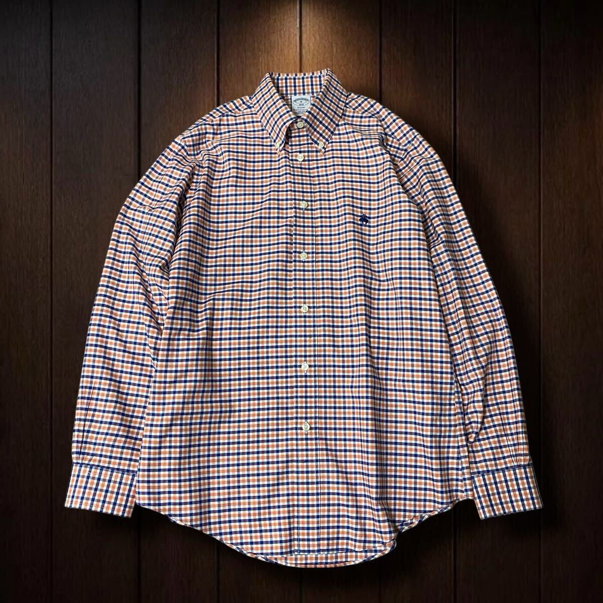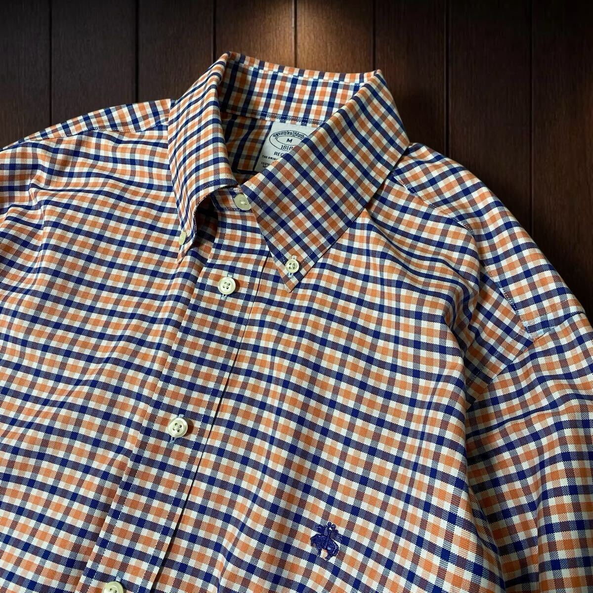 Brooks Brothersのチェック柄ボタンダウンシャツです。オレンジとネイビーのチェックが特徴的で、カジュアルながらも上品な印象を与えます。左胸にはブランドロゴの刺繍が入っています。