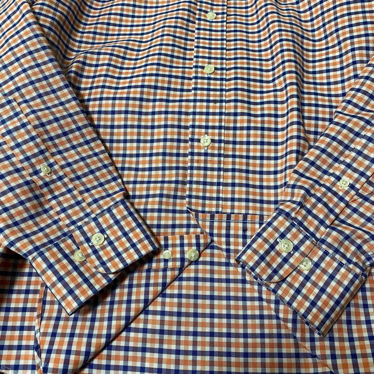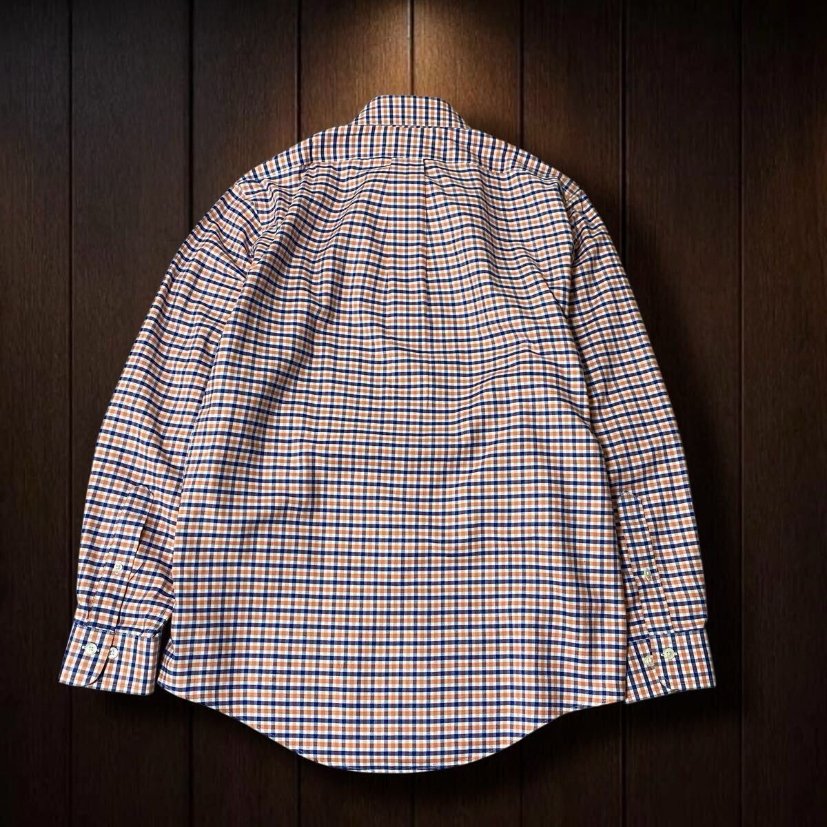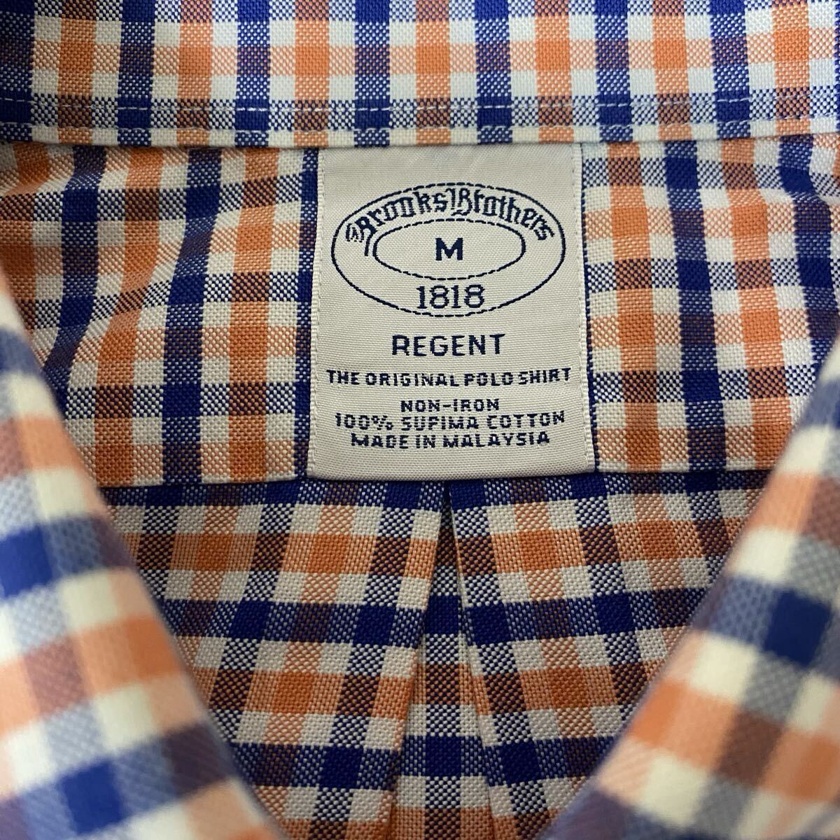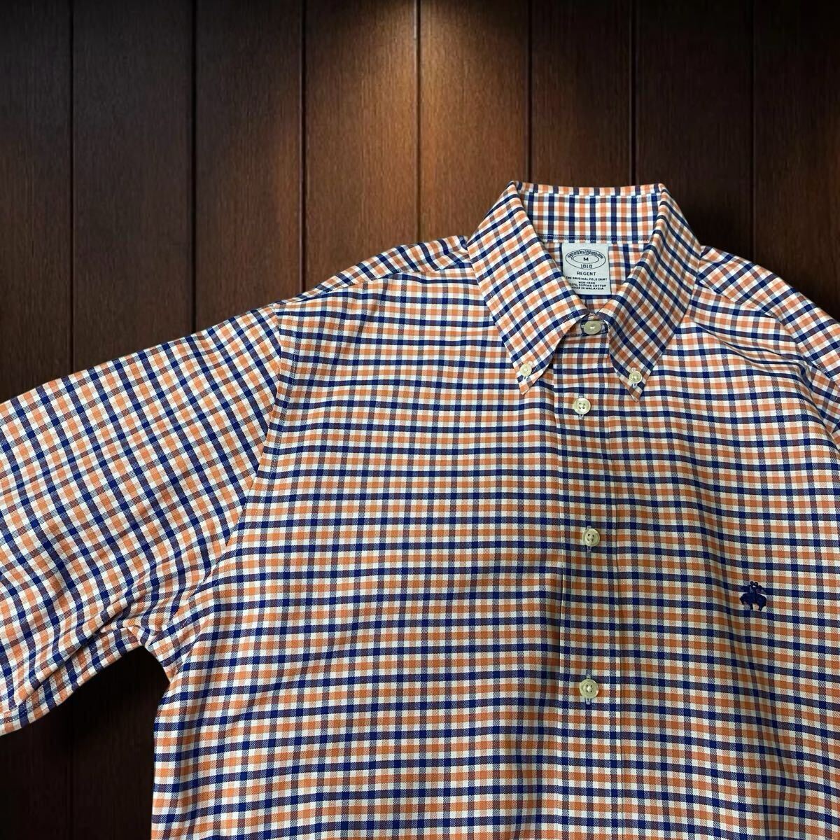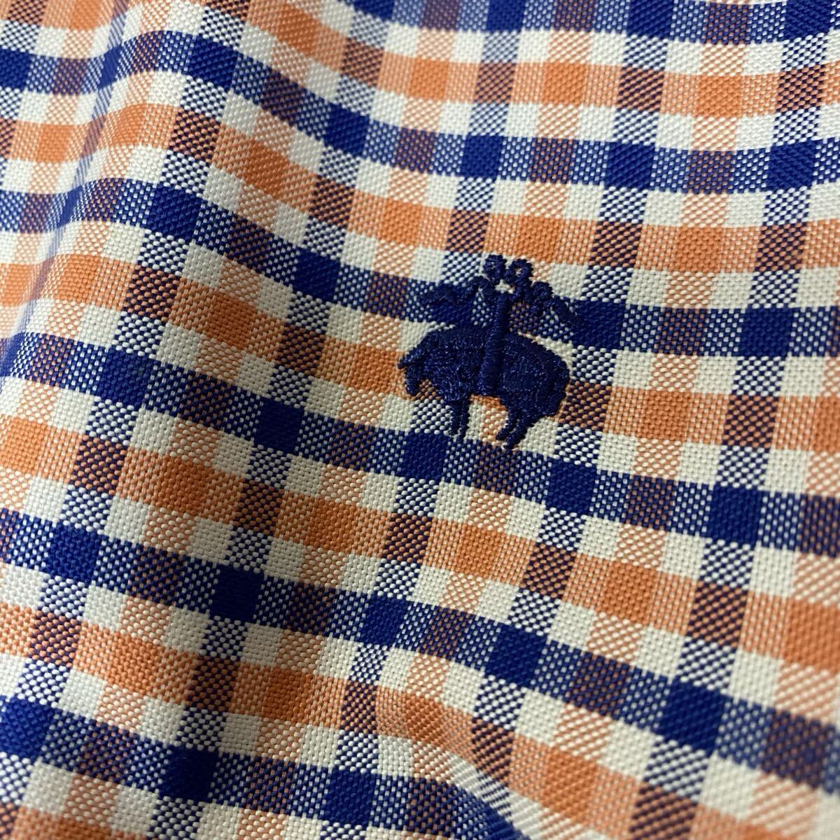 Brooks Brothersのチェック柄ボタンダウンシャツです。オレンジとネイビーのチェックが特徴的で、カジュアルながらも上品な印象を与えます。左胸にはブランドロゴの刺繍が入っています。